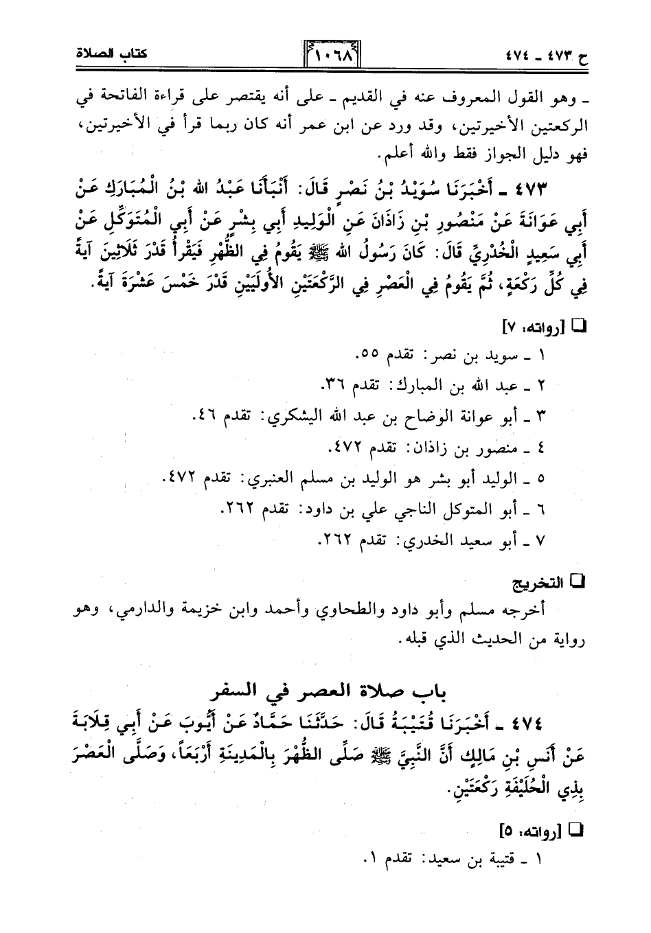 473 - أَخْبَرَنَا سُوَيْدُ بْنُ نَصْرٍ قَالَ: أَنْبَأَنَا عَبْدُ اللَّهِ بْنُ الْمُبَارَكِ عَنْ أَبِي عَوَانَةَ عَنْ مَنْصُورِ بْنِ زَاذَانَ عَنِ الْوَلِيدِ أَبِي بِشْرٍ عَنْ أَبِي الْمُتَوَكِّلِ عَنْ أَبِي سَعِيدٍ الْخُدْرِيِّ قَالَ: كَانَ رَسُولُ اللَّهِ - صلى الله عليه وسلم - يَقُومُ فِي الظُّهْرِ فَيَقْرَأُ قَدْرَ ثَلَاثِينَ آيَةً فِي كُلِّ رَكْعَةٍ، ثُمَّ يَقُومُ فِي الْعَصْرِ فِي الرَّكْعَتَيْنِ الأُولَيَيْنِ قَدْرَ خَمْسَ عَشْرَةَ آيَةً.