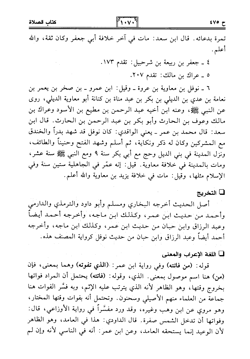 قوله: (من فاتته) وفي رواية ابن عمر: (الذي تفوته) وهما بمعنى، فإن (من) هنا اسم موصول بمعنى. الذي، وقوله: (فاتته) يحتمل أن المراد فواتها بخروج وقتها، وهو الظاهر لأنه الذي يترتب عليه الإثم، وبه فسَّر الفوات هنا جماعة من العلماء منهم الأصيلي وسحنون. وتحتمل أنه بفوات وقتها المختار، وهو مروي عن ابن وهب وغيره، وقد ورد مفسرًا في رواية الأوزاعي، قال: وفواتها أن تدخل الشمس صفرة. قال الداودي: هذا في العامد، وهو الظاهر لأنّ الوعيد إنما يستحقه العامد، وعن ابن عمر: أنه في الناسي لأنه وإن لم