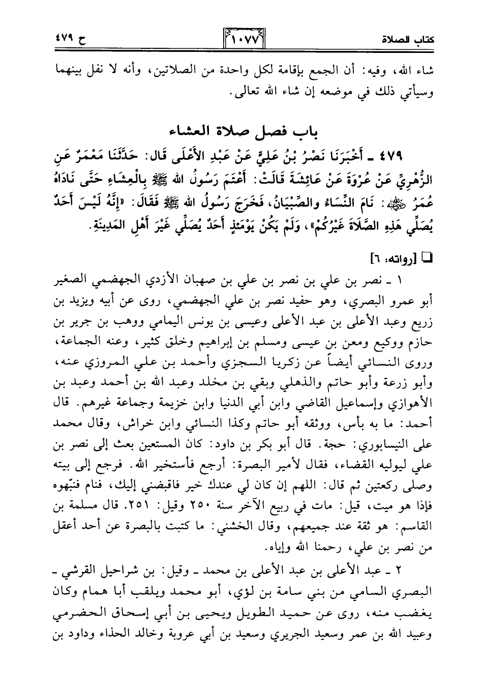 479 - أَخْبَرَنَا نَصْرُ بْنُ عَلِيِّ بْنِ نَصْرٍ عَنْ عَبْدِ الأَعْلَى قَالَ: حَدَّثَنَا مَعْمَرٌ عَنِ الزُّهْرِيِّ عَنْ عُرْوَةَ عَنْ عَائِشَةَ قَالَتْ: أَعْتَمَ رَسُولُ اللَّهِ - صلى الله عليه وسلم - بِالْعِشَاءِ حَتَّى نَادَاهُ عُمَرُ - رضي الله عنه -: نَامَ النِّسَاءُ وَالصِّبْيَانُ، فَخَرَجَ رَسُولُ اللَّهِ - صلى الله عليه وسلم - فَقَالَ: "إِنَّهُ لَيْسَ أَحَدٌ يُصَلِّي هَذِهِ الصَّلَاةَ غَيْرُكُمْ". وَلَمْ يَكُنْ يَوْمَئِذٍ أَحَدٌ يُصَلِّي غَيْرَ أَهْلِ الْمَدِينَةِ.