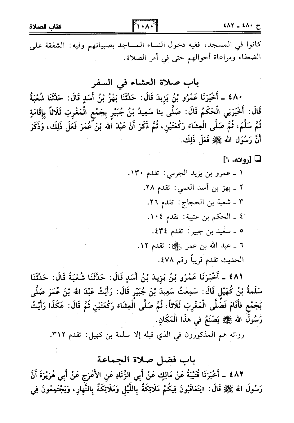 481 - أَخْبَرَنَا عَمْرُو بْنُ يَزِيدَ بن أسد قَالَ: حَدَّثَنَا شُعْبَةُ قَالَ: حَدَّثَنَا سَلَمَةُ بْنُ كُهَيْلٍ قَالَ: سَمِعْتُ سَعِيدَ بْنَ جُبَيْرٍ قَالَ: رَأَيْتُ عَبْدَ اللَّهِ بْنَ عُمَرَ صَلَّى بِجَمْعٍ فَأَقَامَ فَصَلَّى الْمَغْرِبَ ثَلَاثًا، ثُمَّ صَلَّى الْعِشَاءَ رَكْعَتَيْنِ ثُمَّ قَالَ: هَكَذَا رَأَيْتُ رَسُولَ اللَّهِ - صلى الله عليه وسلم - يَصْنَعُ فِي هَذَا الْمَكَانِ.