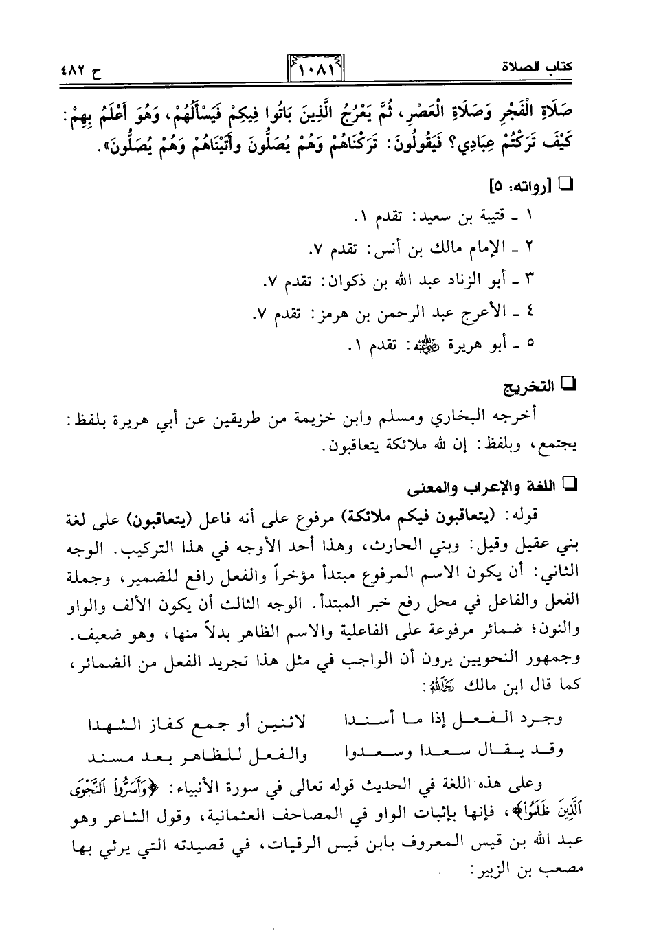 قوله: (يتعاقبون فيكم ملائكة) مرفوع على أنه فاعل (يتعاقبون) على لغة بني عقيل وقيل: وبني الحارث، وهذا أحد الأوجه في هذا التركيب. الوجه الثاني: أن يكون الاسم المرفوع مبتدأ مؤخرًا والفعل رافع للضمير، وجملة الفعل والفاعل في محل رفع خبر المبتدأ. الوجه الثالث أن يكون الألف والواو والنون؛ ضمائر مرفوعة على الفاعلية والاسم الظاهر بدلًا منها، وهو ضعيف. وجمهور النحويين يرون أن الواجب في مثل هذا تجريد الفعل من الضمائر، كما قال ابن مالك -رحمه الله-: