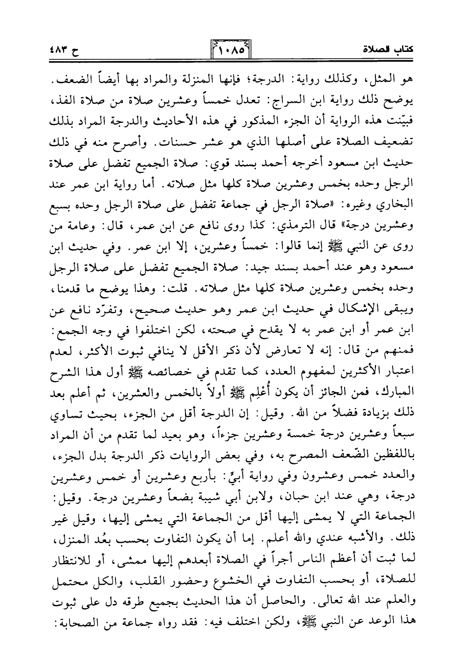 هو المثل، وكذلك رواية: الدرجة؛ فإنها المنزلة والمراد بها أيضًا الضعف. يوضح ذلك رواية ابن السراج: تعدل خمسًا وعشرين صلاة من صلاة الفذ، فبيّنت هذه الرواية أن الجزء المذكور في هذه الأحاديث والدرجة المراد بذلك تضعيف الصلاة على أصلها الذي هو عشر حسنات. وأصرح منه في ذلك حديث ابن مسعود أخرجه أحمد بسند قوي: صلاة الجميع تفضل على صلاة الرجل وحده بخمس وعشرين صلاة كلها مثل صلاته. أما رواية ابن عمر عند البخاري وغيره: "صلاة الرجل في جماعة تفضل على صلاة الرجل وحده بسبع وعشرين درجة" قال الترمذي: كذا روى نافع عن ابن عمر، قال: وعامة من روى عن النبي- صلى الله عليه وسلم - إنما قالوا: خمسًا وعشرين، إلا ابن عمر. وفي حديث ابن مسعود وهو عند أحمد بسند جيد: صلاة الجميع تفضل على صلاة الرجل وحده بخمس وعشرين صلاة كلها مثل صلاته. قلت: وهذا يوضح ما قدمنا، ويبقى الإشكال في حديث ابن عمر وهو حديث صحيح، وتفرّد نافع عن ابن عمر أو ابن عمر به لا يقدح في صحته، لكن اختلفوا في وجه الجمع: فمنهم من قال: إنه لا تعارض لأنّ ذكر الأقل لا ينافي ثبوت الأكثر، لعدم اعتبار الأكثرين لمفهوم العدد، كما تقدم في خصائصه - صلى الله عليه وسلم - أول هذا الشرح المبارك، فمن الجائز أن يكون أُعْلِم - صلى الله عليه وسلم - أولًا بالخمس والعشرين، ثم أعلم بعد ذلك بزيادة فضلًا من الله. وقيل: إن الدرجة أقل من الجزء، بحيث تساوي سبعًا وعشرين درجة خمسة وعشرين جزءًا، وهو بعيد لما تقدم من أن المراد باللفظين الضّعف المصرح به، وفي بعض الروايات ذكر الدرجة بدل الجزء، والعدد خمس وعشرون وفي رواية أبيٍّ: بأربع وعشرين أو خمس وعشرين درجة، وهي عند ابن حبان، ولابن أبي شيبة بضعًا وعشرين درجة. وقيل: الجماعة التي لا يمشي إليها أقل من الجماعة التي يمشي إليها، وقيل غير ذلك. والأشبه عندي والله أعلم. إما أن يكون التفاوت بحسب بعُد المنزل، لما ثبت أن أعظم الناس أجرًا في الصلاة أبعدهم إليها ممشى، أو للإنتظار للصلاة، أو بحسب التفاوت في الخشوع وحضور القلب، والكل محتمل والعلم عند الله تعالى. والحاصل أن هذا الحديث بجميع طرقه دل على ثبوت هذا الوعد عن النبي - صلى الله عليه وسلم -، ولكن اختلف فيه: فقد رواه جماعة من الصحابة: