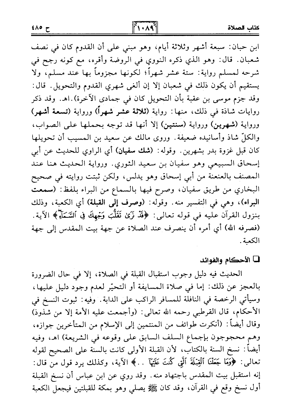 ابن حبان: سبعة أشهر وثلاثة أيام، وهو مبني على أن القدوم كان في نصف شعبان. قال: وهو الذي ذكره النووي في الروضة وأقره، مع كونه رجح في شرحه لمسلم رواية: ستة عشر شهرًا؛ لكونها مجزومًا بها عند مسلم، ولا يستقيم أن يكون ذلك في شعبان إلا إن ألغى شهري القدوم والتحويل. قال: وقد جزم موسى بن عقبة بأن التحويل كان في جمادى الآخرة). اهـ. وقد ذكر روايات شاذة في ذلك، منها: رواية (ثلاثة عشر شهرًا) ورواية (تسعة أشهر) ورواية (شهرين) ورواية (سنتين) إلا أنها قد توجه بحملها على الصواب، والكلّ شاذ وأسانيده ضعيفة. وروى مالك عن سعيد بن المسيب أن تحويلها كان قبل غزوة بدر بشهرين. وقوله: (شك سفيان) أي الراوي للحديث عن أبي إسحاق السبيعي وهو سفيان بن سعيد الثوري. ورواية الحديث هنا عند المصنف بالعنعنة من أبي إسحاق وهو يدلس، ولكن ثبتت روايته في صحيح البخاري من طريق سفيان، وصرح فيها بالسماع من البراء بلفظ: (سمعت البراء)، وهي في التفسير منه. وقوله: (وصرت إلى القبلة) أي الكعبة، وذلك بنزول القرآن عليه في قوله تعالى: {قَدْ نَرَى تَقَلُّبَ وَجْهِكَ فِي السَّمَاءِ} الآية. (فصرفه الله) أي أمره أن ينصرف عند الصلاة عن جهة بيت المقدس إلى جهة الكعبة.