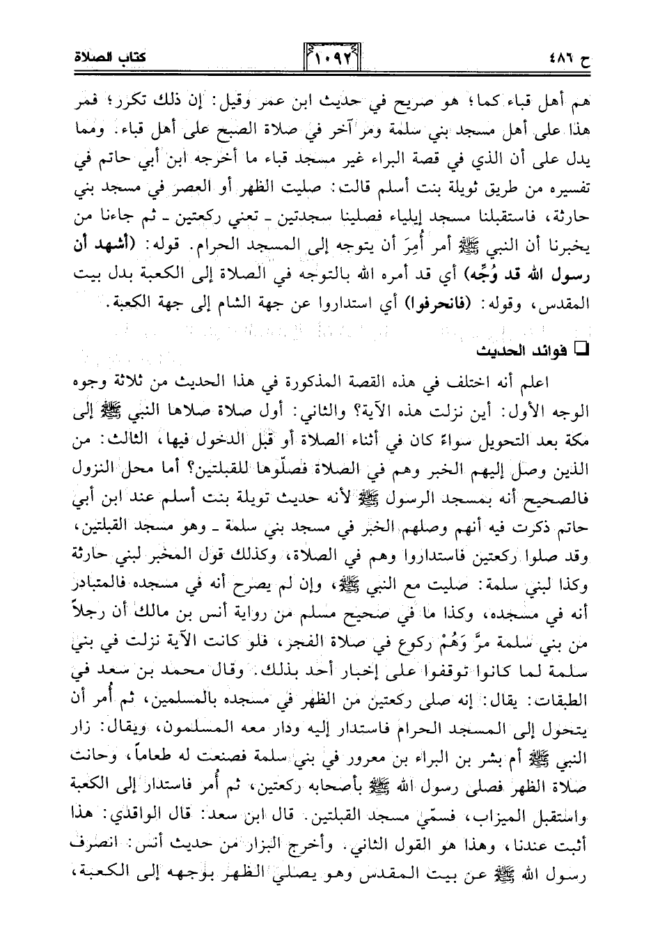 اعلم أنه اختلف في هذه القصة المذكورة في هذا الحديث من ثلاثة وجوه الوجه الأول: أين نزلت هذه الآية؟ والثاني: أول صلاة صلاها النبي - صلى الله عليه وسلم - إلى مكة بعد التحويل سواءً كان في أثناء الصلاة أو قبل الدخول فيها، الثالث: من الذين وصل إليهم الخبر وهم في الصلاة فصلّوها للقبلتين؟ أما محل النزول فالصحيح أنه بمسجد الرسول - صلى الله عليه وسلم - لأنه حديث تويلة بنت أسلم عند ابن أبي حاتم ذكرت فيه أنهم وصلهم الخبر في مسجد بني سلمة -وهو مسجد القبلتين، وقد صلوا ركعتين فاستداروا وهم في الصلاة، وكذلك قول المخبر لبني حارثة وكذا لبني سلمة: صليت مع النبي - صلى الله عليه وسلم -، وإن لم يصرح أنه في مسجده فالمتبادر أنه في مسجده، وكذا ما في صحيح مسلم من رواية أنس بن مالك أن رجلًا من بني سلمة مرَّ وَهُمْ ركوع في صلاة الفجر، فلو كانت الآية نزلت في بني سلمة لما كانوا توقفوا على إخبار أحد بذلك. وقال محمَّد بن سعد في الطبقات: يقال: إنه صلى ركعتين من الظهر في مسجده بالمسلمين، ثم أمر أن يتحول إلى المسجد الحرام فاستدار إليه ودار معه المسلمون، ويقال: زار النبي - صلى الله عليه وسلم - أم بشر بن البراء بن معرور في بني سلمة فصنعت له طعامًا، وحانت صلاة الظهر فصلى رسول الله - صلى الله عليه وسلم - بأصحابه ركعتين، ثم أُمر فاستدار إلى الكعبة واستقبل الميزاب، فسمّي مسجد القبلتين. قال ابن سعد: قال الواقدي: هذا أثبت عندنا، وهذا هو القول الثاني. وأخرج البزار من حديث أنس: انصرف رسول الله - صلى الله عليه وسلم - عن بيت المقدس وهو يصلي الظهر بوجهه إلى الكعبة،