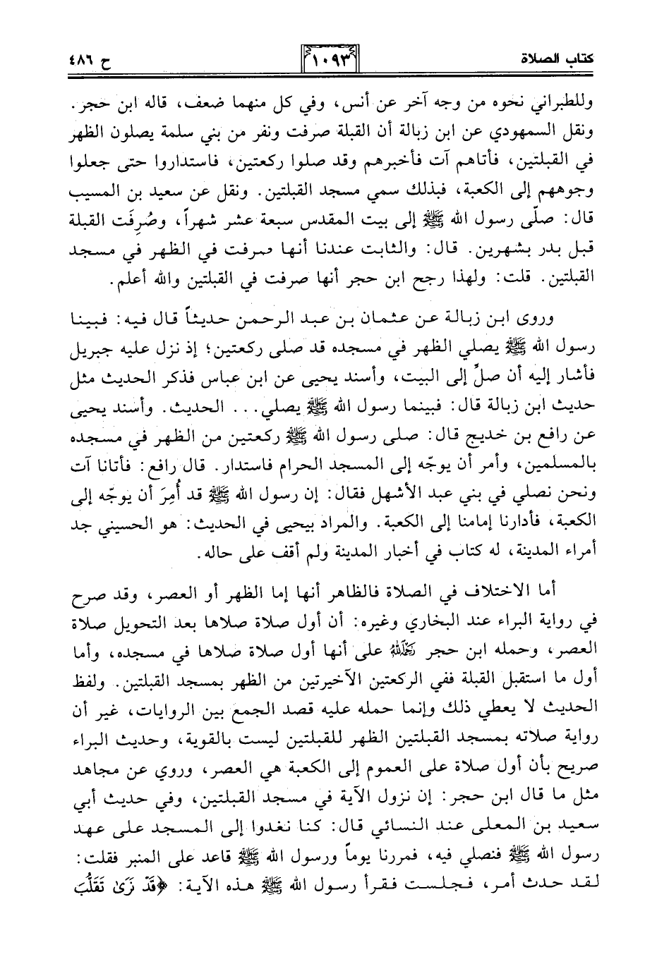 وللطبراني نحوه من وجه آخر عن أنس، وفي كل منهما ضعف، قاله ابن حجر. ونقل السمهودي عن ابن زبالة أن القبلة صرفت ونفر من بني سلمة يصلون الظهر في القبلتين، فأتاهم آت فأخبرهم وقد صلوا ركعتين، فاستداروا حتى جعلوا وجوههم إلى الكعبة، فبذلك سمي مسجد القبلتين. ونقل عن سعيد بن المسيب قال: صلّى رسول الله - صلى الله عليه وسلم - إلى بيت المقدس سبعة عشر شهرًا، وصُرِفَت القبلة قبل بدر بشهرين. قال: والثابت عندنا أنها صرفت في الظهر في مسجد القبلتين. قلت: ولهذا رجح ابن حجر أنها صرفت في القبلتين والله أعلم.