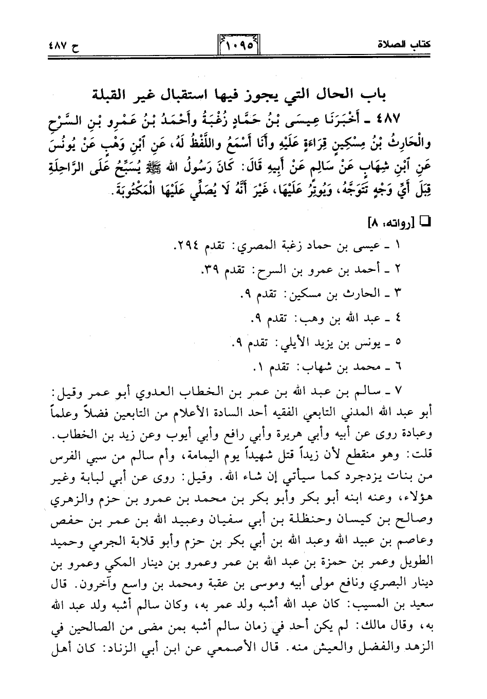 7 - سالم بن عبد الله بن عمر بن الخطاب العدوي أبو عمر وقيل: أبو عبد الله المدني التابعي الفقيه أحد السادة الأعلام من التابعين فضلًا وعلمًا وعبادة روى عن أبيه وأبي هريرة وأبي رافع وأبي أيوب وعن زيد بن الخطاب. قلت: وهو منقطع لأنّ زيدًا قتل شهيدًا يوم اليمامة، وأم سالم من سبي الفرس من بنات يزدجرد كما سيأتي إن شاء الله. وقيل: روى عن أبي لبابة وغير هؤلاء، وعنه ابنه أبو بكر وأبو بكر بن محمَّد بن عمرو بن حزم والزهري وصالح بن كيسان وحنظلة بن أبي سفيان وعبيد الله بن عمر بن حفص وعاصم بن عبيد الله وعبد الله بن أبي بكر بن حزم وأبو قلابة الجرمي وحميد الطويل وعمر بن حمزة بن عبد الله بن عمر وعمرو بن دينار المكي وعمرو بن دينار البصري ونافع مولى أبيه وموسى بن عقبة ومحمد بن واسع وآخرون. قال سعيد بن المسيب: كان عبد الله أشبه ولد عمر به، وكان سالم أشبه ولد عبد الله به، وقال مالك: لم يكن أحد في زمان سالم أشبه بمن مضى من الصالحين في الزهد والفضل والعيش منه. قال الأصمعي عن ابن أبي الزناد: كان أهل