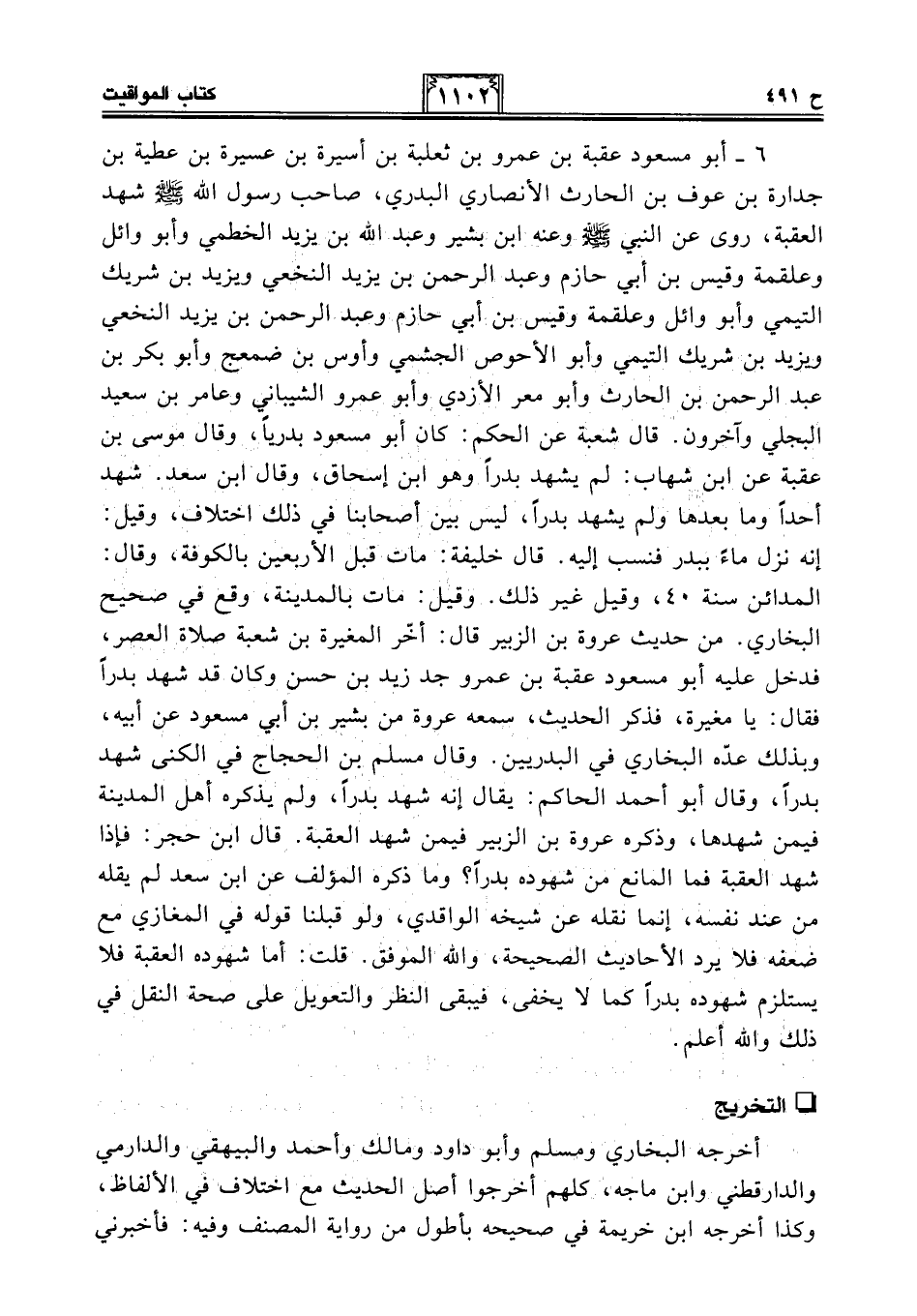 6 - أبو مسعود عقبة بن عمرو بن ثعلبة بن أسيرة بن عسيرة بن عطية بن جدارة بن عوف بن الحارث الأنصاري البدري، صاحب رسول الله - صلى الله عليه وسلم - شهد العقبة، روى عن النبي - صلى الله عليه وسلم - وعنه ابن بشير وعبد الله بن يزيد الخطمي وأبو وائل وعلقمة وقيس بن أبي حازم وعبد الرحمن بن يزيد النخعي ويزيد بن شريك التيمي وأبو وائل وعلقمة وقيس بن أبي حازم وعبد الرحمن بن يزيد النخعي ويزيد بن شريك التيمي وأبو الأحوص الجشمي وأوس بن ضمعج وأبو بكر بن عبد الرحمن بن الحارث وأبو معر الأزدي وأبو عمرو الشيباني وعامر بن سعيد البجلي وآخرون. قال شعبة عن الحكم: كان أبو مسعود بدريًا، وقال موسى بن عقبة عن ابن شهاب: لم يشهد بدرًا وهو ابن إسحاق، وقال ابن سعد. شهد أحدًا وما بعدها ولم يشهد بدرًا، ليس بين أصحابنا في ذلك اختلاف، وقيل: إنه نزل ماءً ببدر فنسب إليه. قال خليفة: مات قبل الأربعين بالكوفة، وقال: المدائن سنة 40، وقيل غير ذلك. وقيل: مات بالمدينة، وقع في صحيح البخاري. من حديث عروة بن الزبير قال: أخّر المغيرة بن شعبة صلاة العصر، فدخل عليه أبو مسعود عقبة بن عمرو جد زيد بن حسن وكان قد شهد بدرًا فقال: يا مغيرة، فذكر الحديث، سمعه عروة من بشير بن أبي مسعود عن أبيه، وبذلك عدّه البخاري في البدريين. وقال مسلم بن الحجاج في الكنى شهد بدرًا، وقال أبو أحمد الحاكم: يقال إنه شهد بدرًا، ولم يذكره أهل المدينة فيمن شهدها، وذكره عروة بن الزبير فيمن شهد العقبة. قال ابن حجر: فإذا شهد العقبة فما المانع من شهوده بدرًا؟ وما ذكره المؤلف عن ابن سعد لم يقله من عند نفسه، إنما نقله عن شيخه الواقدي، ولو قبلنا قوله في المغازي مع ضعفه فلا يرد الأحاديث الصحيحة والله الموفق. قلت: أما شهوده العقبة فلا يستلزم شهوده بدرًا كما لا يخفى، فيبقى النظر والتعويل على صحة النقل في ذلك والله أعلم.