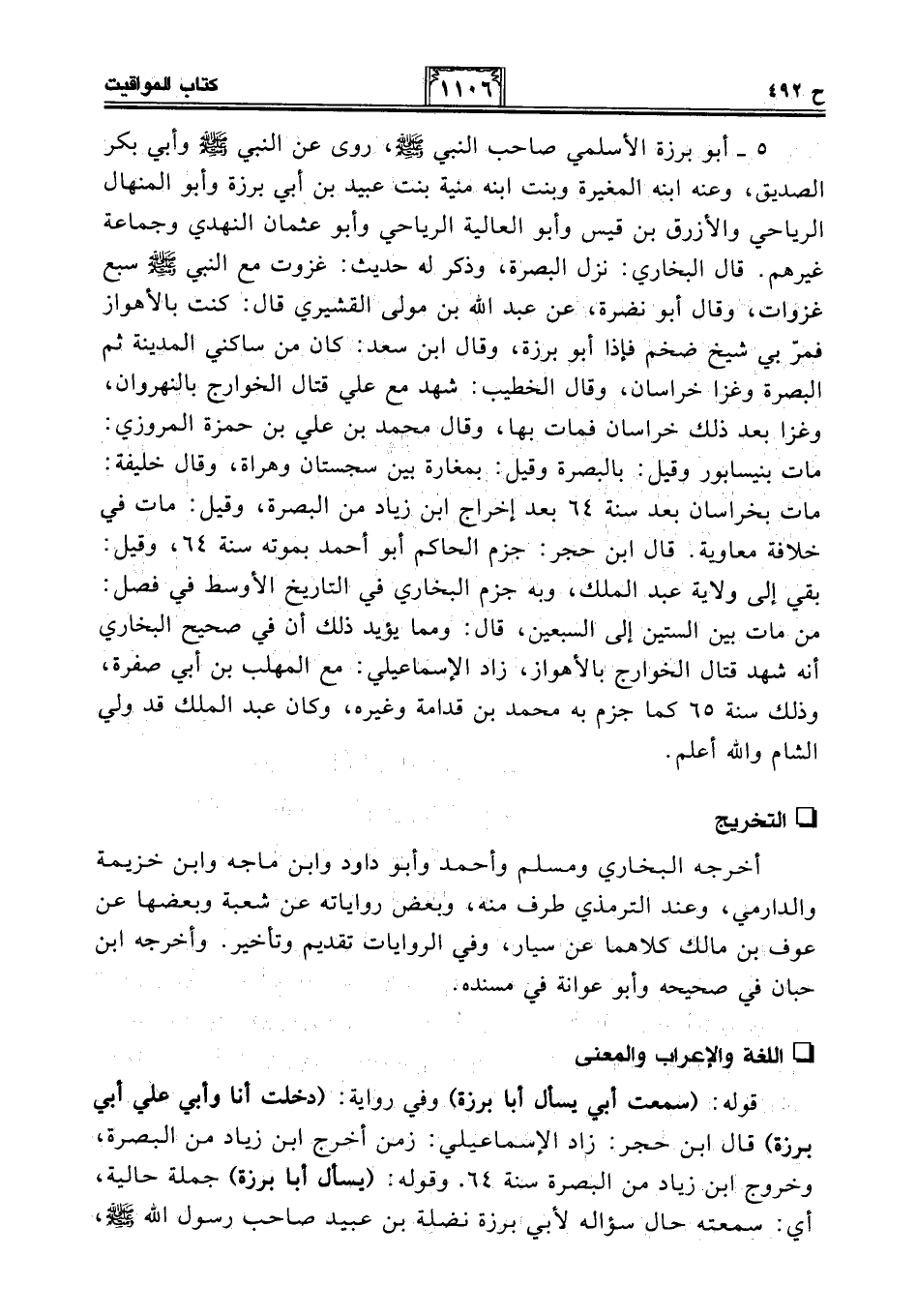 5 - أبو برزة الأسلمي صاحب النبي - صلى الله عليه وسلم -، روى عن النبي - صلى الله عليه وسلم - وأبي بكر الصديق، وعنه ابنه المغيرة وبنت ابنه منية بنت عبيد بن أبي برزة وأبو المنهال الرياحي والأزرق بن قيس وأبو العالية الرياحي وأبو عثمان النهدي وجماعة غيرهم. قال البخاري: نزل البصرة، وذكر له حديث: غزوت مع النبي - صلى الله عليه وسلم - سبع غزوات، وقال أبو نضرة، عن عبد الله بن مولى القشيري قال: كنت بالأهواز فمرّ بي شيخ ضخم فإذا أبو برزة، وقال ابن سعد: كان من ساكني المدينة ثم البصرة وغزا خراسان، وقال الخطيب: شهد مع علي قتال الخوارج بالنهروان، وغزا بعد ذلك خراسان فمات بها، وقال محمَّد بن علي بن حمزة المروزي: مات بنيسابور وقيل: بالبصرة وقيل: بمغارة بين سجستان وهراة، وقال خليفة: مات بخراسان بعد سنة 64 بعد إخراج ابن زياد من البصرة، وقيل: مات في خلافة معاوية. قال ابن حجر: جزم الحاكم أبو أحمد بموته سنة 64، وقيل: بقي إلى ولاية عبد الملك، وبه جزم البخاري في التاريخ الأوسط في فصل: من مات بين الستين إلى السبعين، قال: ومما يؤيد ذلك أن في صحيح البخاري أنه شهد قتال الخوارج بالأهواز، زاد الإسماعيلي: مع المهلب بن أبي صفرة، وذلك سنة 65 كما جزم به محمَّد بن قدامة وغيره، وكان عبد الملك قد ولي الشام والله أعلم.