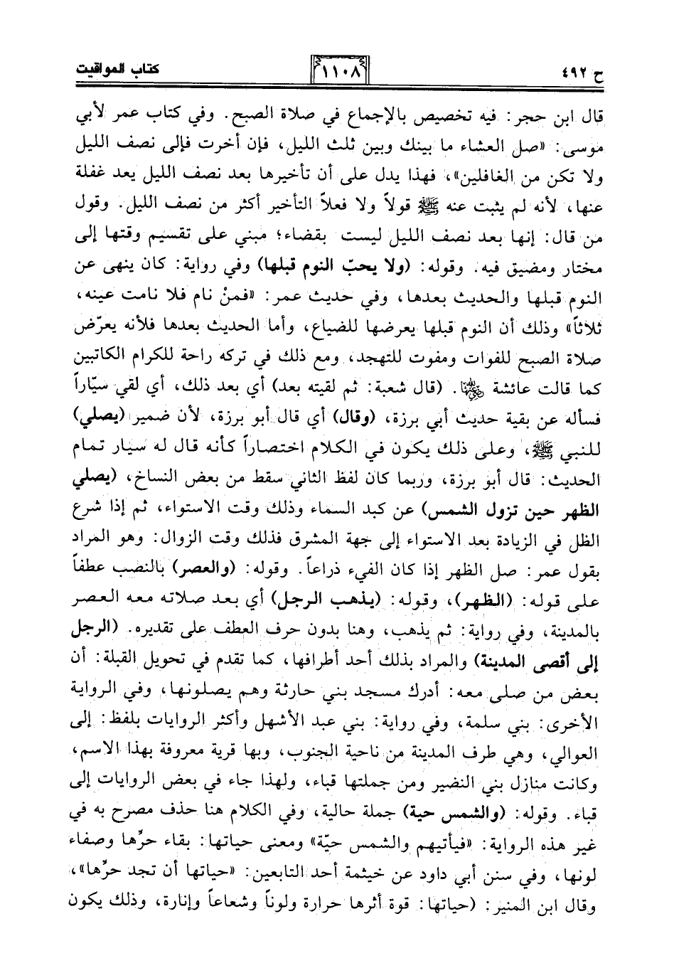 قال ابن حجر: فيه تخصيص بالإجماع في صلاة الصبح. وفي كتاب عمر لأبي موسى: "صل العشاء ما بينك وبين ثلث الليل، فإن أخرت فإلى نصف الليل ولا تكن من الغافلين"، فهذا يدل على أن تأخيرها بعد نصف الليل يعد غفلة عنها، لأنه لم يثبت عنه - صلى الله عليه وسلم - قولًا ولا فعلًا التأخير أكثر من نصف الليل. وقول من قال: إنها بعد نصف الليل ليست بقضاء؛ مبني على تقسيم وقتها إلى مختار ومضيق فيه. وقوله: (ولا يحبّ النوم قبلها) وفي رواية: كان ينهى عن النوم قبلها والحديث بعدها، وفي حديث عمر: "فمنْ نام فلا نامت عينه، ثلاثًا" وذلك أن النوم قبلها يعرضها للضياع، وأما الحديث بعدها فلأنه يعرّض صلاة الصبح للفوات ومفوت للتهجد، ومع ذلك في تركه راحة للكرام الكاتبين كما قالت عائشة -رضي الله عنها-. (قال شعبة: ثم لقيته بعد) أي بعد ذلك، أي لقي سيارا فسأله عن بقية حديث أبي برزة، (وقال) أي قال أبو برزة، لأن ضمير (يصلي) للنبي - صلى الله عليه وسلم -، وعلى ذلك يكون في الكلام اختصارًا كأنه قال له سيار تمام الحديث: قال أبو برزة، وربما كان لفظ الثاني سقط من بعض النساخ، (يصلي الظهر حين تزول الشمس) عن كبد السماء وذلك وقت الإستواء، ثم إذا شرع الظل في الزيادة بعد الإستواء إلى جهة المشرق فذلك وقت الزوال: وهو المراد يقول عمر: صل الظهر إذا كان الفيء ذراعًا. وقوله: (والعصر) بالنصب عطفا على قوله: (الظهر)، وقوله: (يذهب الرجل) أي بعد صلاته معه العصر بالمدينة، وفي رواية: ثم يذهب، وهنا بدون حرف العطف على تقديره. (الرجل إلى أقصى المدينة) والمراد بذلك أحد أطرافها، كما تقدم في تحويل القبلة: أن بعض من صلى معه: أدرك مسجد بني حارثة وهم يصلونها، وفي الرواية الأخرى: بني سلمة، وفي رواية: بني عبد الأشهل وأكثر الروايات بلفظ: إلى العوالي، وهي طرف المدينة من ناحية الجنوب، وبها قرية معروفة بهذا الاسم، وكانت منازل بني النضير ومن جملتها قباء، ولهذا جاء في بعض الروايات إلى قباء. وقوله: (والشمس حية) جملة حالية، وفي الكلام هنا حذف مصرح به في غير هذه الرواية: "فيأتيهم والشمس حيّة" ومعنى حياتها: بقاء حرَّها وصفاء لونها، وفي سنن أبي داود عن خيثمة أحد التابعين: "حياتها أن تجد حرِّها"، وقال ابن المنير: (حياتها: قوة أثرها حرارة ولونًا وشعاعًا وإنارة، وذلك يكون