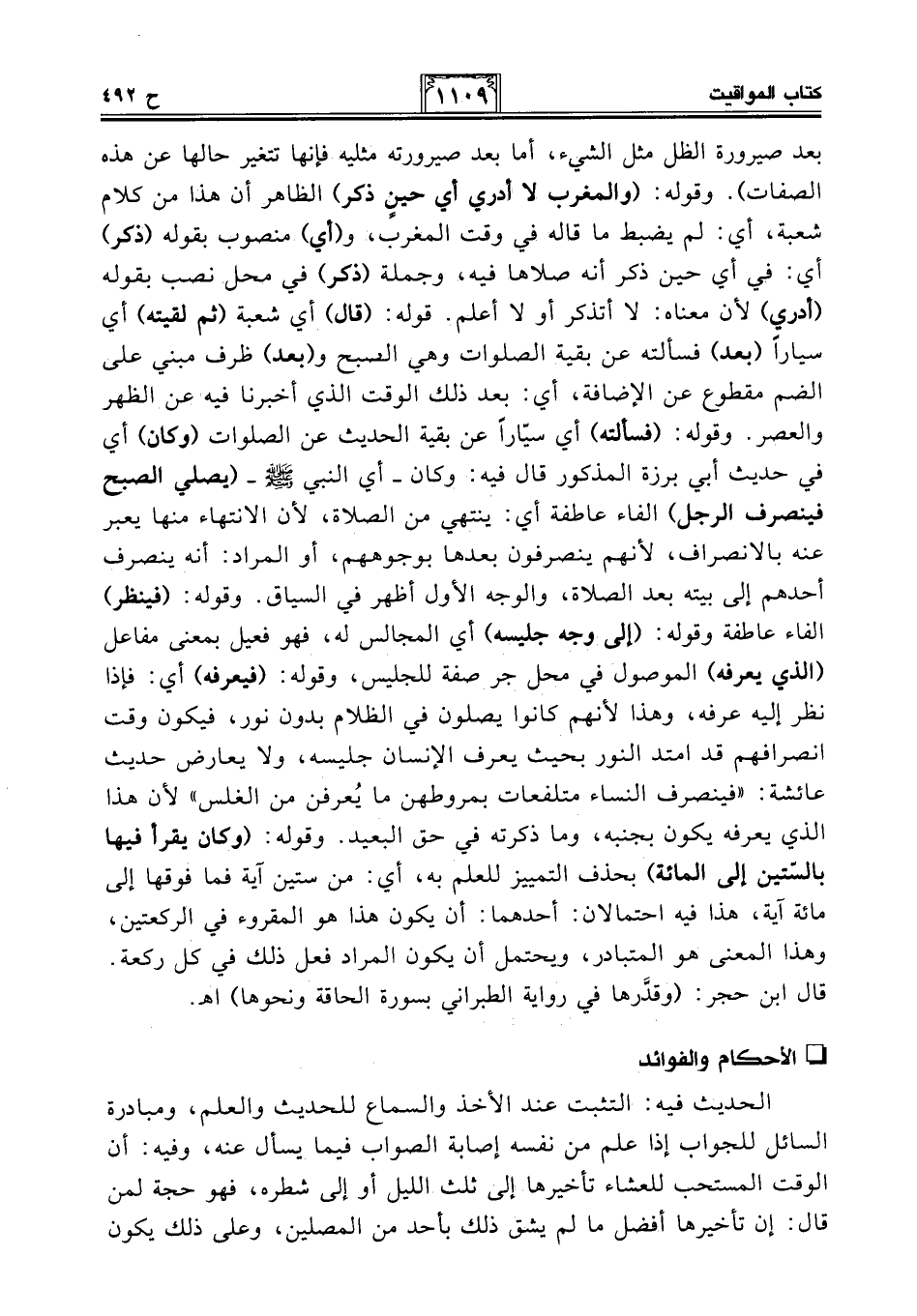 بعد صيرورة الظل مثل الشيء، أما بعد صيرورته مثليه فإنها تتغير حالها عن هذه الصفات). وقوله: (والمغرب لا أدري أي حينٍ ذكر) الظاهر أن هذا من كلام شعبة، أي: لم يضبط ما قاله في وقت المغرب، و (أي) منصوب بقوله (ذكر) أي: في أي حين ذكر أنه صلاها فيه، وجملة (ذكر) في محل نصب بقوله (أدري) لأن معناه: لا أتذكر أو لا أعلم. قوله: (قال) أي شعبة (ثم لقيته) أي سيارًا (بعد) فسألته عن بقية الصلوات وهي الصبح و (بعد) ظرف مبني على الضم مقطوع عن الإضافة، أي: بعد ذلك الوقت الذي أخبرنا فيه عن الظهر والعصر. وقوله: (فسألته) أي سيّارًا عن بقية الحديث عن الصلوات (وكان) أي في حديث أبي برزة المذكور قال فيه: وكان -أي النبي - صلى الله عليه وسلم - (يصلي الصبح فينصرف الرجل) الفاء عاطفة أي: ينتهي من الصلاة، لأن الإنتهاء منها يعبر عنه بالإنصراف، لأنهم ينصرفون بعدها بوجوههم، أو المراد: أنه ينصرف أحدهم إلى بيته بعد الصلاة، والوجه الأول أظهر في السياق. وقوله: (فينظر) الفاء عاطفة وقوله: (إلي وجه جليسه) أي المجالس له، فهو فعيل بمعنى مفاعل (الذي يعرفه) الموصول في محل جر صفة للجليس، وقوله: (فيعرفه) أي: فإذا نظر إليه عرفه، وهذا لأنهم كانوا يصلون في الظلام بدون نور، فيكون وقت انصرافهم قد امتد النور بحيث يعرف الإنسان جليسه، ولا يعارض حديث عائشة: "فينصرف النساء متلفعات بمروطهن ما يُعرفن من الغلس" لأن هذا الذي يعرفه يكون بجنبه، وما ذكرته في حق البعيد. وقوله: (وكان يقرأ فيها بالستين إلى المائة) بحذف التمييز للعلم به، أي: من ستين آية فما فوقها إلى مائة آية، هذا فيه احتمالان: أحدهما: أن يكون هذا هو المقروء في الركعتين، وهذا المعنى هو المتبادر، ويحتمل أن يكون المراد فعل ذلك في كل ركعة. قال ابن حجر: (وقدَّرها في رواية الطبراني بسورة الحاقة ونحوها) اهـ.