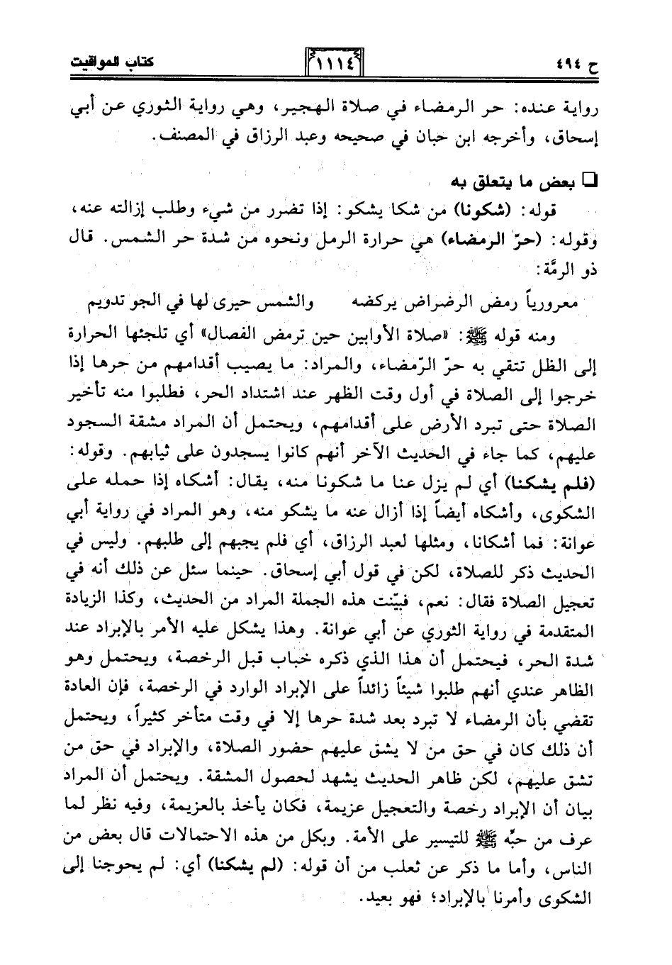 ومنه قوله - صلى الله عليه وسلم -: "صلاة الأوابين حين ترمض الفصال" أي تلجئها الحرارة إلى الظل تتقي به حرٌ الرمضاء، والمراد: ما يصيب أقدامهم من حرها إذا خرجوا إلى الصلاة في أول وقت الظهر عند اشتداد الحر، فطلبوا منه تأخير الصلاة حتى تبرد الأرض على أقدامهم، ويحتمل أن المراد مشقة السجود عليهم، كما جاء في الحديث الآخر أنهم كانوا يسجدون على ثيابهم. وقوله: (فلم يشكنا) أي لم يزل عنا ما شكونا منه، يقال: أشكاه إذا حمله على الشكوى، وأشكاه أيضًا إذا أزال عنه ما يشكو منه، وهو المراد في رواية أبي عوانة: فما أشكانا، ومثلها لعبد الرزاق، أي فلم يجبهم إلى طلبهم. وليس في الحديث ذكر للصلاة، لكن في قول أبي إسحاق. حينما سئل عن ذلك أنه في تعجيل الصلاة فقال: نعم، فبينت هذه الجملة المراد من الحديث، وكذا الزيادة المتقدمة في رواية الثوري عن أبي عوانة. وهذا يشكل عليه الأمر بالإبراد عند شدة الحر، فيحتمل أن هذا الذي ذكره خباب قبل الرخصة، ويحتمل وهو الظاهر عندي أنهم طلبوا شيئًا زائدًا على الإبراد الوارد في الرخصةٌ، فإن العادة تقضي بأن الرمضاء لا تبرد بعد شدة حرها إلا في وقت متأخر كثيرًا، ويحتمل أن ذلك كان في حق من لا يشق عليهم حضور الصلاة، والإبراد في حق من تشق عليهم، لكن ظاهر الحديث يشهد لحصول المشقة. ويحتمل أن المراد بيان أن الإبراد رخصة والتعجيل عزيمة، فكان يأخذ بالعزيمة، وفيه نظر لما عرف من حبه - صلى الله عليه وسلم - للتيسير على الأمة. وبكل من هذه الاحتمالات قال بعض من الناس، وأما ما ذكر عن ثعلب من أن قوله: (لم يشكنا) أي: لم يحوجنا إلى الشكوى وأمرنا) بالإبراد؛ فهو بعيد.