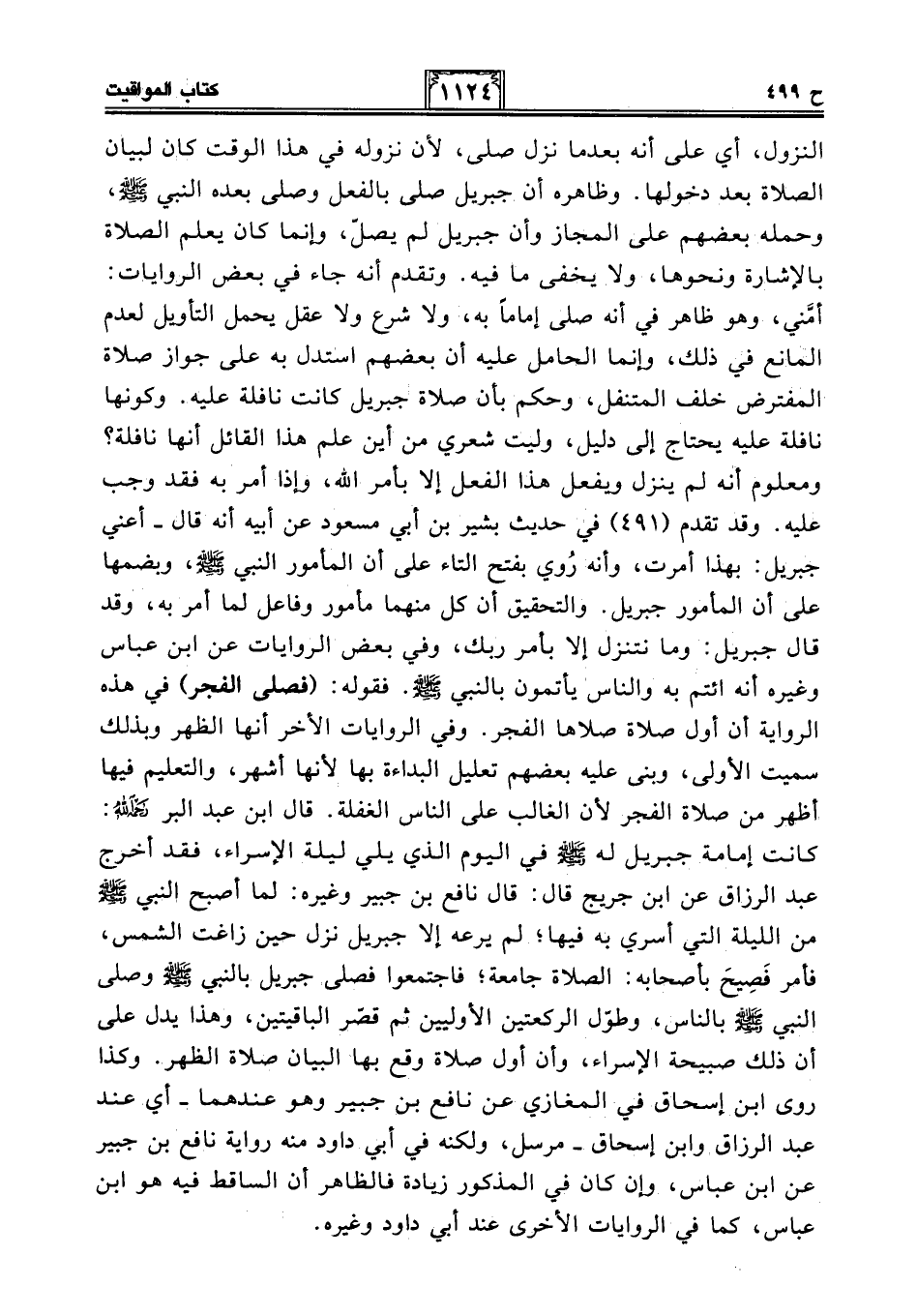 النزول، أي على أنه بعدما نزل صلى، لأن نزوله في هذا الوقت كان لبيان الصلاة بعد دخولها. وظاهره أن جبريل صلى بالفعل وصلى بعده النبي - صلى الله عليه وسلم -، وحمله بعضهم على المجاز وأن جبريل لم يصل، وإنما كان يعلم الصلاة بالإشارة ونحوها، ولا يخفى ما فيه. وتقدم أنه جاء في بعض الروايات: أمَّني، وهو ظاهر في أنه صلى إماما به، ولا شرع ولا عقل يحمل التأويل لعدم المانع في ذلك، وإنما الحامل عليه أن بعضهم استدل به على جواز صلاة المفترض خلف المتنفل، وحكم بأن صلاة جبريل كانت نافلة عليه. وكونها نافلة عليه يحتاج إلى دليل، وليت شعري من أين علم هذا القائل أنها نافلة؟ ومعلوم أنه لم ينزل ويفعل هذا الفعل إلا بأمر الله، وإذا أمر به فقد وجب عليه. وقد تقدم (491) في حديث بشير بن أبي مسعود عن أبيه أنه قال -أعني جبريل: بهذا أمرت، وأنه رُوي بفتح التاء على أن المأمور النبي - صلى الله عليه وسلم -، وبضمها على أن المأمور جبريل. والتحقيق أن كل منهما مأمور وفاعل لما أمر به، وقد قال جبريل: وما نتنزل إلا بأمر ربك، وفي بعض الروايات عن ابن عباس وغيره أنه ائتم به والناس يأتمون بالنبي - صلى الله عليه وسلم -. فقوله: (فصلى الفجر) في هذه الرواية أن أول صلاة صلاها الفجر. وفي الروايات الأخر أنها الظهر وبذلك سميت الأولى، وبنى عليه بعضهم تعليل البداءة بها لأنها أشهر، والتعليم فيها أظهر من صلاة الفجر لأن الغالب على الناس الغفلة. قال ابن عبد البر -رحمه الله-: كانت إمامة جبريل له - صلى الله عليه وسلم - في اليوم الذي يلي ليلة الإسراء، فقد أخرج عبد الرزاق عن ابن جريج قال: قال نافع بن جبير وغيره: لما أصبح النبي - صلى الله عليه وسلم - من الليلة التي أسري به فيها؛ لم يرعه إلا جبريل نزل حين زاغت الشمس، فأمر فَصِيحَ بأصحابه: الصلاة جامعة؛ فاجتمعوا فصلى جبريل بالنبي - صلى الله عليه وسلم - وصلى النبي - صلى الله عليه وسلم - بالناس، وطول الركعتين الأوليين ثم قصر الباقيتين، وهذا يدل على أن ذلك صبيحة الإسراء، وأن أول صلاة وقع بها البيان صلاة الظهر. وكذا روى ابن إسحاق في المغازي عن نافع بن جبير وهو عندهما -أي عند عبد الرزاق وابن إسحاق- مرسل، ولكنه في أبي داود منه رواية نافع بن جبير عن ابن عباس، وإن كان في المذكور زيادة فالظاهر أن الساقط فيه هو ابن عباس، كما في الروايات الأخرى عند أبي داود وغيره.