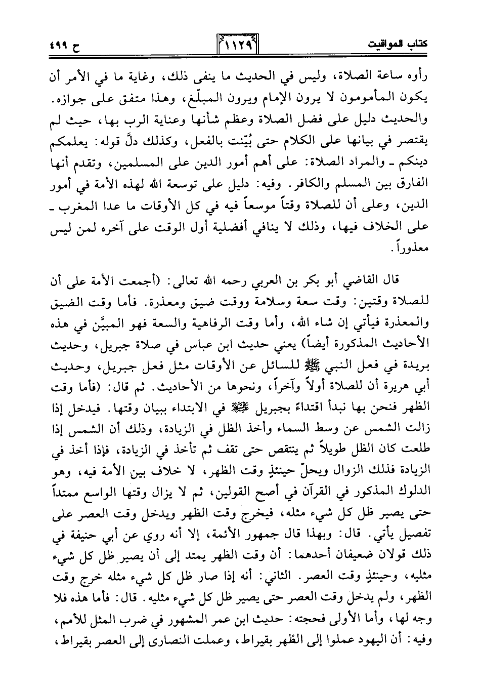 قال القاضي أبو بكر بن العربي رحمه الله تعالى: (أجمعت الأمة على أن للصلاة وقتين: وقت سعة وسلامة ووقت ضيق ومعذرة. فأما وقت الضيق والمعذرة فيأتي إن شاء الله، وأما وقت الرفاهية والسعة فهو المبيَّن في هذه الأحاديث المذكورة أيضًا) يعني حديث ابن عباس في صلاة جبريل، وحديث بريدة في فعل النبي - صلى الله عليه وسلم - للسائل عن الأوقات مثل فعل جبريل، وحديث أبي هريرة أن للصلاة أولًا وآخرا، ونحوها من الأحاديث. ثم قال: (فأما وقت الظهر فنحن بها نبدأ اقتداءً بجبريل -عليه السلام- في الإبتداء ببيان وقتها. فيدخل إذا زالت الشمس عن وسط السماء وأخذ الظل في الزيادة، وذلك أن الشمس إذا طلعت كان الظل طويلًا ثم ينتقص حتى تقف ثم تأخذ في الزيادة، فإذا أخذ في الزيادة فذلك الزوال ويحل حينئذٍ وقت الظهر، لا خلاف بين الأمة فيه، وهو الدلوك المذكور في القرآن في أصح القولين، ثم لا يزال وقتها الواسع ممتدًا حتى يصير ظل كل شيء مثله، فيخرج وقت الظهر ويدخل وقت العصر على تفصيل يأتي. قال: وبهذا قال جمهور الأئمة، إلا أنه روي عن أبي حنيفة في ذلك قولان ضعيفان أحدهما: أن وقت الظهر يمتد إلى أن يصير ظل كل شيء مثليه، وحينئذٍ وقت العصر. الثاني: أنه إذا صار ظل كل شيء مثله خرج وقت الظهر، ولم يدخل وقت العصر حتى يصير ظل كل شيء مثليه. قال: فأما هذه فلا وجه لها، وأما الأولى فحجته: حديث ابن عمر المشهور في ضرب المثل للأمم، وفيه: أن اليهود عملوا إلى الظهر بقيراط، وعملت النصارى إلى العصر بقيراط،
