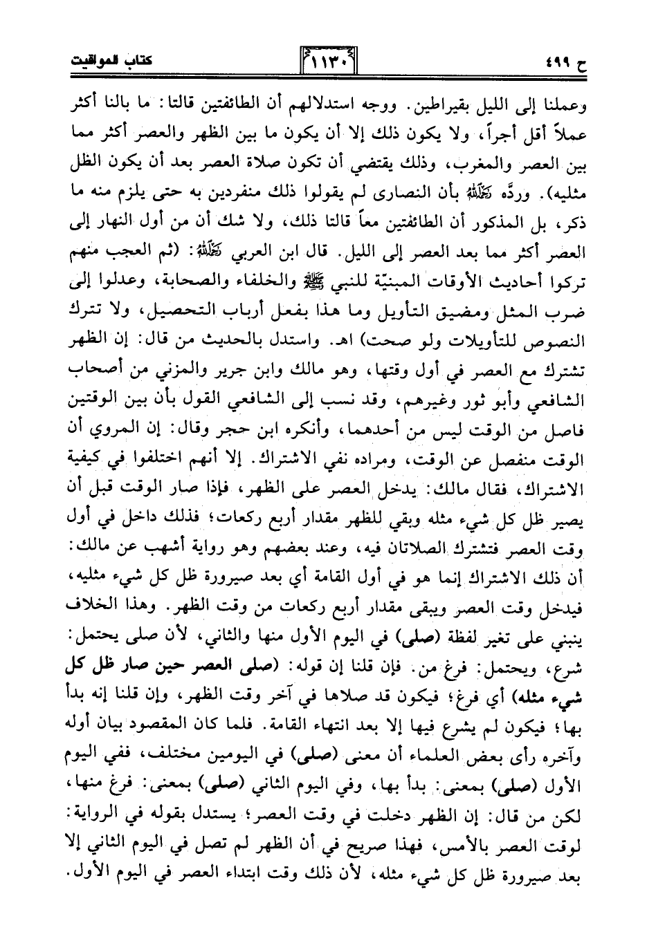 وعملنا إلى الليل بقيراطين. ووجه استدلالهم أن الطائفتين قالتا: ما بالنا أكثر عملًا أقل أجرًا، ولا يكون ذلك إلا أن يكون ما بين الظهر والعصر أكثر مما بين العصر والمغرب، وذلك يقتضي أن تكون صلاة العصر بعد أن يكون الظل مثليه). وردَّه -رحمه الله- بأن النصارى لم يقولوا ذلك منفردين به حتى يلزم منه ما ذكر، بل المذكور أن الطائفتين معًا قالتا ذلك، ولا شك أن من أول النهار إلى العصر أكثر مما بعد العصر إلى الليل. قال ابن العربي -رحمه الله-: (ثم العجب منهم تركوا أحاديث الأوقات المبنيّة للنبي - صلى الله عليه وسلم - والخلفاء والصحابة، وعدلوا إلى ضرب المثل ومضيق التأويل وما هذا بفعل أرباب التحصيل، ولا تترك النصوص للتأويلات ولو صحت) اهـ. واستدل بالحديث من قال: إن الظهر تشترك مع العصر في أول وقتها، وهو مالك وابن جرير والمزني من أصحاب الشافعي وأبو ثور وغيرهم، وقد نسب إلى الشافعي القول بأن بين الوقتين فاصل من الوقت ليس من أحدهما، وأنكره ابن حجر وقال: إن المروي أن الوقت منفصل عن الوقت، ومراده نفي الإشتراك. إلا أنهم اختلفوا في كيفية الإشتراك، فقال مالك: يدخل العصر على الظهر، فإذا صار الوقت قبل أن يصير ظل كل شيء مثله وبقي للظهر مقدار أربع ركعات؛ فذلك داخل في أول وقت العصر فتشترك الصلاتان فيه، وعند بعضهم وهو رواية أشهب عن مالك: أن ذلك الإشتراك إنما هو في أول القامة أي بعد صيرورة ظل كل شيء مثليه، فيدخل وقت العصر ويبقى مقدار أربع ركعات من وقت الظهر. وهذا الخلاف ينبني على تغير لفظة (صلى) في اليوم الأول منها والثاني، لأن صلى يحتمل: شرع، ويحتمل: فرغ من. فإن قلنا إن قوله: (صلى العصر حين صار ظل كل شيء مثله) أي فرغ؛ فيكون قد صلاها في آخر وقت الظهر، وإن قلنا إنه بدأ بها؛ فيكون لم يشرع فيها إلا بعد إنتهاء القامة. فلما كان المقصود بيان أوله وآخره رأى بعض العلماء أن معنى (صلى) في اليومين مختلف، ففي اليوم الأول (صلى) بمعنى: بدأ بها، وفي اليوم الثاني (صلى) بمعنى: فرغ منها، لكن من قال: إن الظهر دخلت في وقت العصر؛ يستدل بقوله في الرواية: لوقت العصر بالأمس، فهذا صريح في أن الظهر لم تصل في اليوم الثاني إلا بعد صيرورة ظل كل شيء مثله، لأن ذلك وقت ابتداء العصر في اليوم الأول.