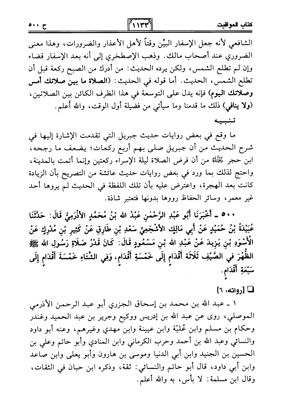 500 - أَخْبَرَنَا أَبُو عَبْدِ الرَّحْمَنِ عَبْدُ اللَّهِ بْنُ مُحَمَّدٍ الأَذْرَمِيُّ قَالَ: حَدَّثَنَا عَبِيدَةُ بْنُ حُمَيْدٍ عَنْ أَبِي مَالِكٍ الأَشْجَعِيِّ سَعْدِ بْنِ طَارِقٍ عَنْ كَثِيرِ بْنِ مُدْرِكٍ عَنِ الأَسْوَدِ بْنِ يَزِيدَ عَنْ عَبْدِ اللَّهِ بْنِ مَسْعُودٍ قَالَ: كَانَ قَدْرُ صَلَاةِ رَسُولِ اللَّهِ - صلى الله عليه وسلم - الظُّهْرَ فِي الصَّيْفِ ثَلَاثَةَ أَقْدَامٍ إِلَى خَمْسَةِ أَقْدَامٍ، وَفِي الشِّتَاءِ خَمْسَةَ أَقْدَامٍ إِلَى سَبْعَةِ أَقْدَامٍ.