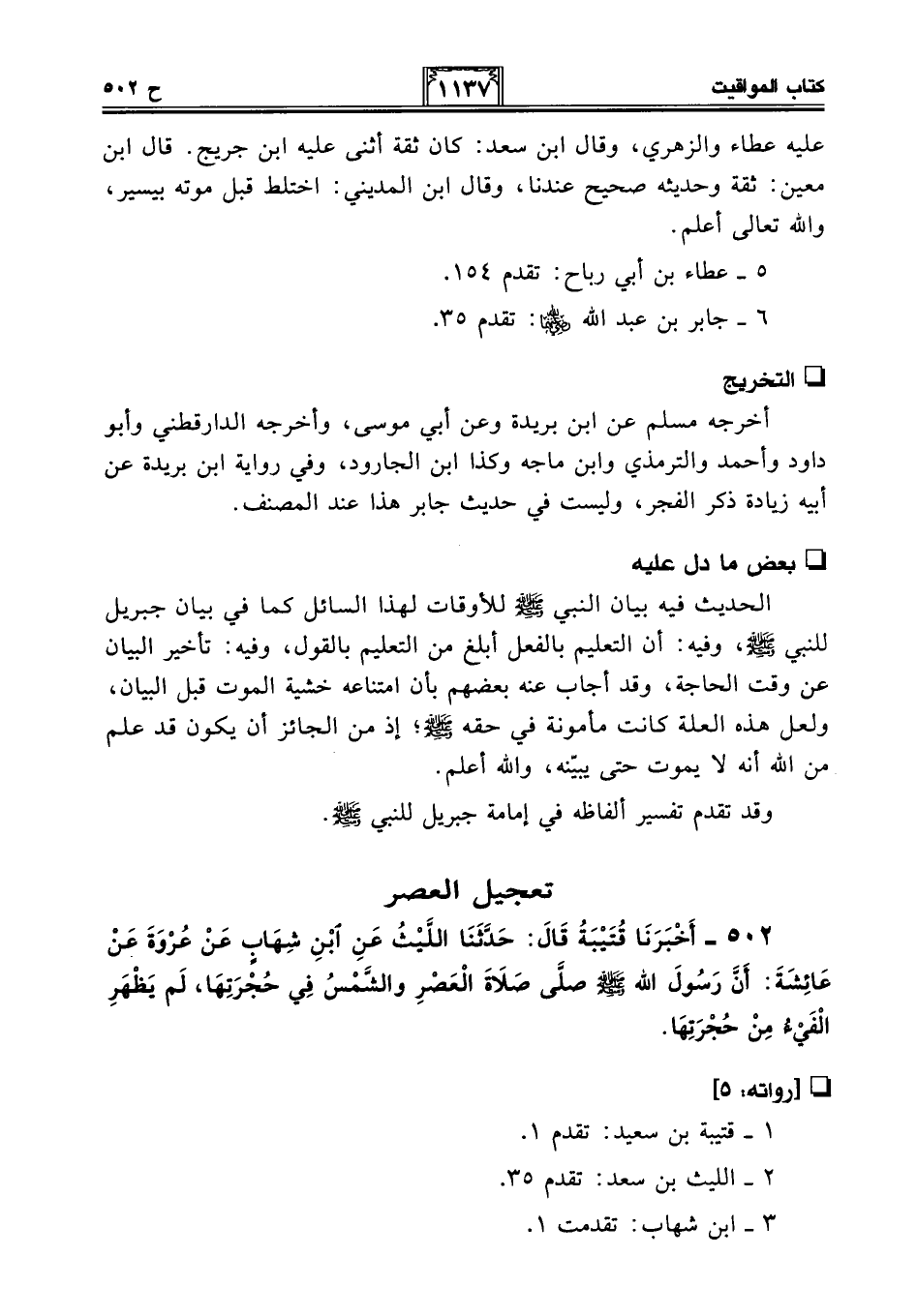 502 - أَخْبَرَنَا قُتَيْبَةُ قَالَ: حَدَّثَنَا اللَّيْثُ عَنِ ابْنِ شِهَابٍ عَنْ عُرْوَةَ عَنْ عَائِشَةَ: أَنَّ رَسُولَ اللَّهِ - صلى الله عليه وسلم - صَلَّى صَلَاةَ الْعَصْرِ وَالشَّمْسُ فِي حُجْرَتِهَا، لَمْ يَظْهَرِ الْفَيْءُ مِنْ حُجْرَتِهَا.