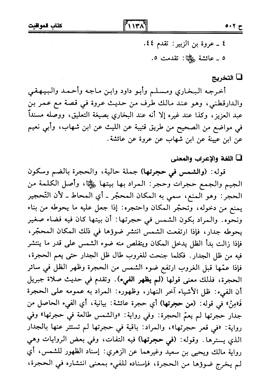 قوله: (والشمس في حجرتها) جملة حالية، والحجرة بالضم وسكون الجيم والجمع حجرات وحجر: المراد بها بيتها -رضي الله عنها-، وأصل الكلمة من الحجر: وهو المنع، سمي به المكان المحجّر -أي المحاط- لأن التّحجير يمنع من دخوله، وتحجّر المكان واحتجره: إذا جعل عليه ما يحوطه من بناء ونحوه. والمراد يكون الشمس في حجرتها: أن بيتها كان فيه فضاء صغير يحوطه جدار، فإذا ارتفعت الشمس انتشر ضوؤها في ذلك المكان المحجّر، فإذا زالت بدأ الظل يدخل المكان ويتقلص منه ضوء الشمس على قدر ما ينتشر فيه من ظل الجدار. فكلما جنحت للغروب طال ظل الجدار حتى يعم الحجرة، فإذا عمّها قبل الغروب ارتفع ضوء الشمس من الحجرة وظهر الظل في سائر الحجرة، فذلك معنى قولها (لم يظهر الفيء). وتقدم في حديث صلاة جبريل أن الفيء: ظل الأشياء آخر النهار، وظهوره: المراد به عمومه على الحجرة فَـ"مِنْ" في قوله: (من حجرتها) أي حجرة عائشة: بيانية، أي الفيء الحاصل من جدار حجرتها لم يعمّ الحجرة: وفي رواية: "والشمس طالعة في حجرتها" وفي رواية: "في قعر حجرتها"، والمراد: باقية في حجرتها لم تستتر عنها بالجدار الذي يسترها. وقوله: (في حجرتها) فيه التفات، وفي بعض الروايات وهي رواية مالك ويحيى بن سعيد وغيرهما عن الزهري: إسناد الظهور للشمس، أي لم يخرج ضوؤها من الحجرة، فإسناده للفيء بمعنى انتشاره في الحجرة،