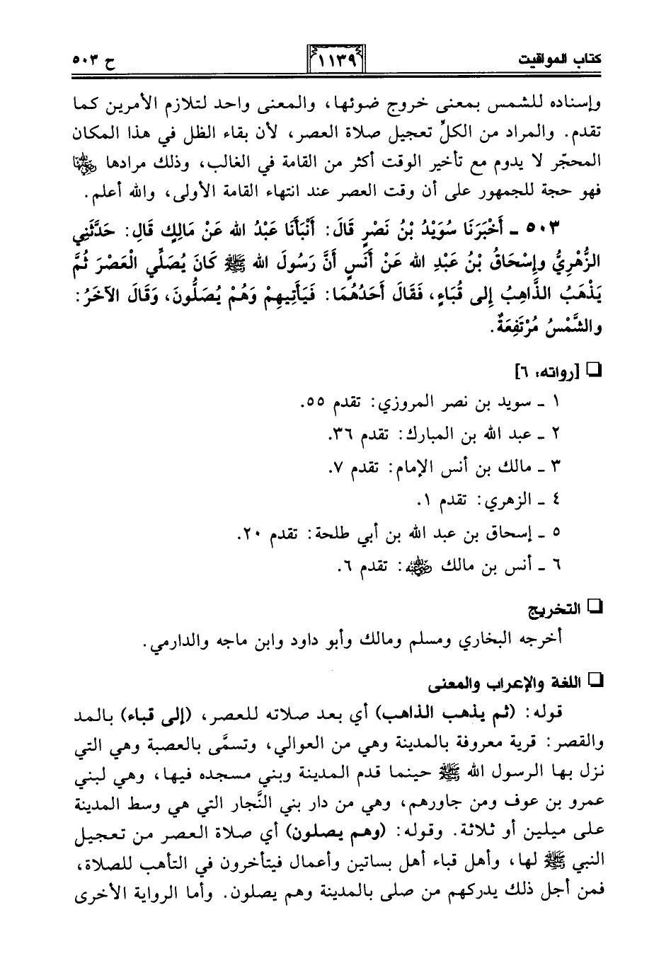 503 - أَخْبَرَنَا سُوَيْدُ بْنُ نَصْرٍ قَالَ: أَنْبَأَنَا عَبْدُ اللَّهِ عَنْ مَالِكٍ قَالَ: حَدَّثَنِي الزُّهْرِيُّ وَإِسْحَاقُ بْنُ عَبْدِ اللَّهِ عَنْ أَنَسٍ أَنَّ رَسُولَ اللَّهِ - صلى الله عليه وسلم - كَانَ يُصَلِّي الْعَصْرَ ثُمَّ يَذْهَبُ الذَّاهِبُ إِلَى قُبَاءٍ، فَقَالَ أَحَدُهُمَا: فَيَأْتِيهِمْ وَهُمْ يُصَلُّونَ وَقَالَ الآخَرُ: وَالشَّمْسُ مُرْتَفِعَةٌ.