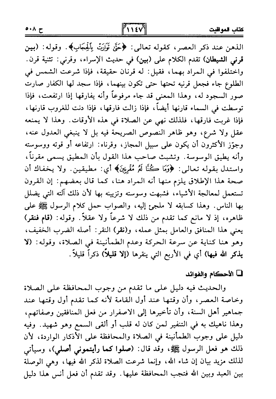 الذهن عند ذكر العصر، كقوله تعالى: {حَتَّى تَوَارَتْ بِالْحِجَابِ}. وقوله: (بين قرني الشيطان) تقدم الكلام على (بين) في حديث الإسراء، وقرني: تثنية قرن. واختلفوا في المراد بهما، فقيل: له قرنان حقيقة، فإذا شرعت الشمس في الطلوع جاء فجعل قرنيه تحتها حتى تكون بينهما، فإذا سجد لها الكفار صارت صور السجود له، وهذا المعنى قد جاء مرفوعًا وأنه يفارقها إذا ارتفعت، فإذا توسطت في السماء قارنها أيضًا، فإذا زالت فارقها، فإذا دنت للغروب قارنها، فإذا غربت فارقها، فلذلك نهي عن الصلاة في هذه الأوقات. وهذا لا يمنعه عقل ولا شرع، وهو ظاهر النصوص الصريحة فيه بل لا ينبغي العدول عنه، وجوّز الأكثرون أن يكون على سبيل المجاز، وقرناه: ارتفاعه أو قوته ووسوسته وأنه يطيق الوسوسة. وتشبث صاحب هذا القول بأن المطيق يسمى مقرنًا، واستدل بقوله تعالى: {وَمَا كُنَّا لَهُ مُقْرِنِينَ} أي: مطيقين. ولا يخفاك أن صحة هذا الإطلاق يلزم منها أنه المراد هنا، كما قال بعضهم: إن القرون تستعمل لمعالجة الأشياء، فشبهت وسوسته وتزيينه بها لأن ذلك آلته التي يضلل بها الناس. وهذا كسابقه لا ملجئ إليه، والصواب حمل كلام الرسول - صلى الله عليه وسلم - على ظاهره، إذ لا مانع كما تقدم من ذلك لا شرعًا ولا عقلًا. وقوله: (قام فنقر) يعني هذا المنافق والعامل بمثل عمله، و (نقر) النقر: أصله الضرب الخفيف، وهو هنا كناية عن سرعة الحركة وعدم الطمأنينة في الصلاة، وقوله: (لا يذكر الله فيها) أي في الأربع التي ينقرها (إلا قليلًا) ذكرًا قليلًا.
