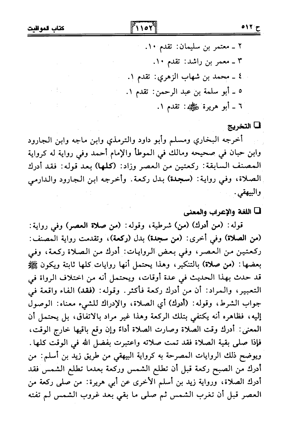 أخرجه البخاري ومسلم وأبو داود والترمذي وابن ماجه وابن الجارود وابن حبان في صحيحه ومالك في الموطأ والإمام أحمد وفي رواية له كرواية المصنف السابقة: ركعتين من العصر وزاد: (كلها) بعد قوله: فقد أدرك الصلاة، وفي رواية: (سجدة) بدل ركعة. وأخرجه ابن الجارود والدارمي والبيهقي.