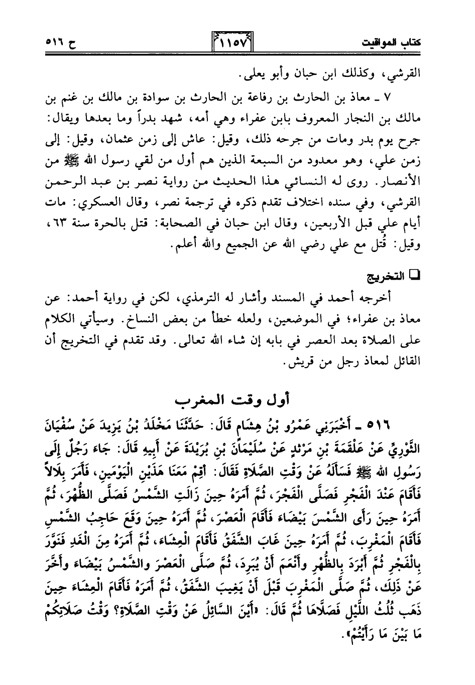 أخرجه أحمد في المسند وأشار له الترمذي، لكن في رواية أحمد: عن معاذ بن عفراء؛ في الموضعين، ولعله خطأ من بعض النساخ. وسيأتي الكلام على الصلاة بعد العصر في بابه إن شاء الله تعالى. وقد تقدم في التخريج أن القائل لمعاذ رجل من قريش.