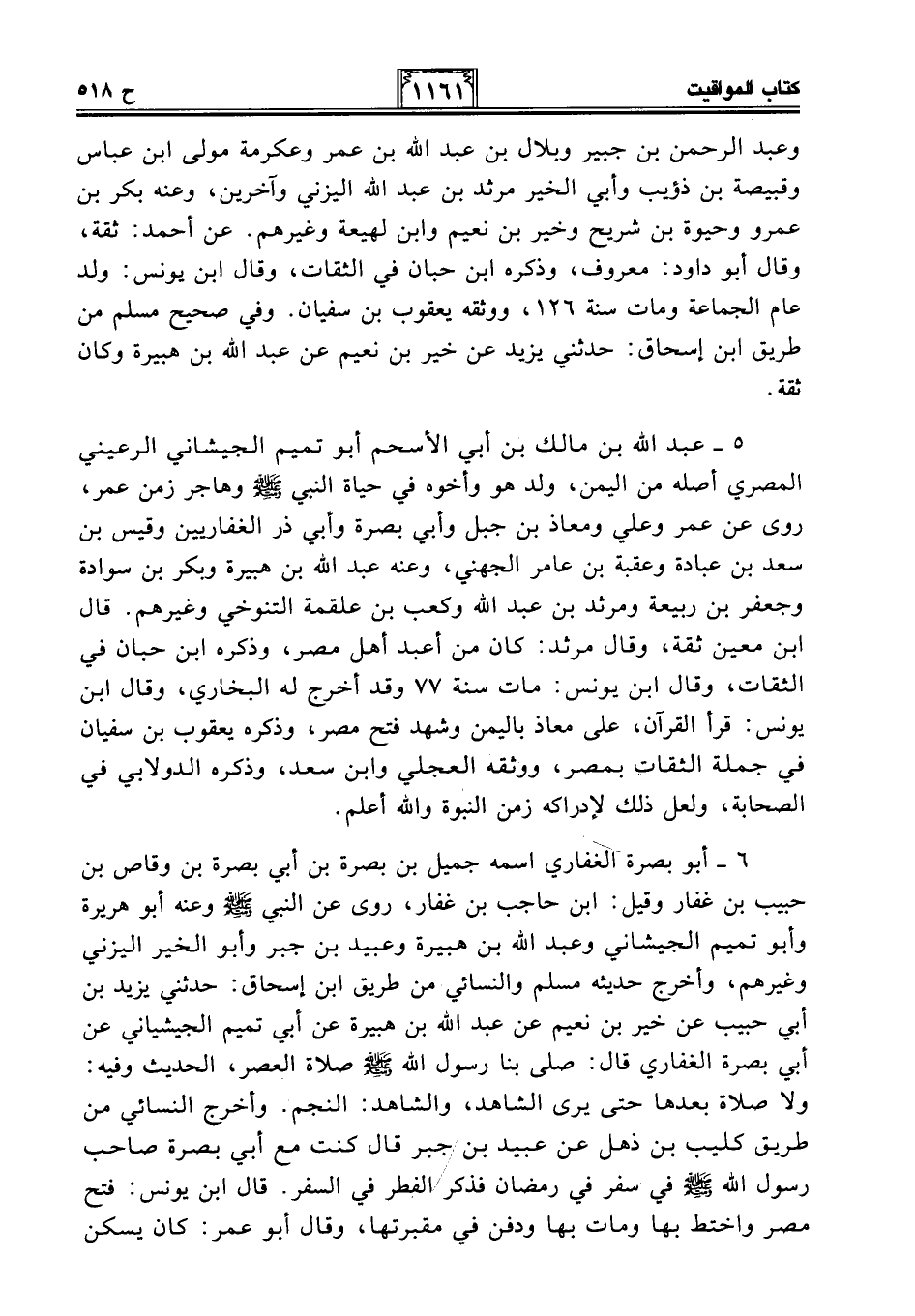 5 - عبد الله بن مالك بن أبي الأسحم أبو تميم الجيشاني الرعيني المصري أصله من اليمن، ولد هو وأخوه في حياة النبي - صلى الله عليه وسلم - وهاجر زمن عمر، روى عن عمر وعلي ومعاذ بن جبل وأبي بصرة وأبي ذر الغفاريين وقيس بن سعد بن عبادة وعقبة بن عامر الجهني، وعنه عبد الله بن هبيرة وبكر بن سوادة وجعفر بن ربيعة ومرثد بن عبد الله وكعب بن علقمة التنوخي وغيرهم. قال ابن معين ثقة، وقال مرثد: كان من أعبد أهل مصر، وذكره ابن حبان في الثقات، وقال ابن يونس: مات سنة 77 وقد أخرج له البخاري، وقال ابن يونس: قرأ القرآن، على معاذ باليمن وشهد فتح مصر، وذكره يعقوب بن سفيان في جملة الثقات بمصر، ووثقه العجلي وابن سعد، وذكره الدولابي في الصحابة، ولعل ذلك لإدراكه زمن النبوة والله أعلم.