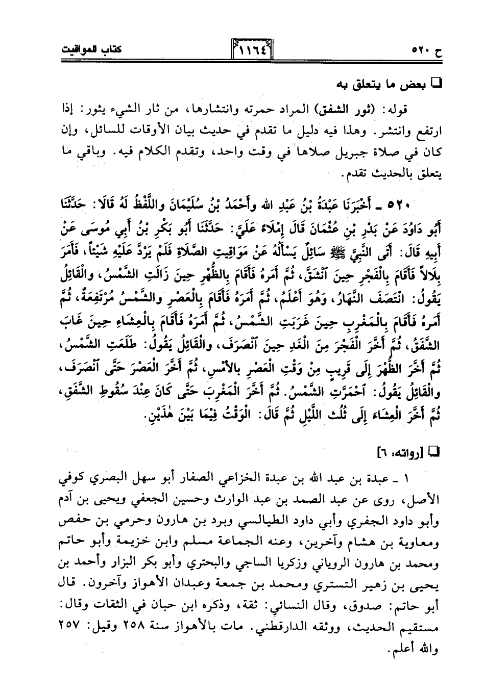 520 - أَخْبَرَنَا عَبْدَةُ بْنُ عَبْدِ اللَّهِ وَأَحْمَدُ بْنُ سُلَيْمَانَ وَاللَّفْظُ لَهُ قَالَا: حَدَّثَنَا أَبُو دَاوُدَ عَنْ بَدْرِ بْنِ عُثْمَانَ قَالَ إِمْلَاءً عَلَيَّ: حَدَّثَنَا أَبُو بَكْرِ بْنُ أَبِي مُوسَى عَنْ أَبِيهِ قَالَ: أَتَى النَّبِيَّ - صلى الله عليه وسلم - سَائِلٌ يَسْأَلُهُ عَنْ مَوَاقِيتِ الصَّلَاةِ فَلَمْ يَرُدَّ عَلَيْهِ شَيْئًا، فَأَمَرَ بِلَالًا فَأَقَامَ بِالْفَجْرِ حِينَ انْشَقَّ، ثُمَّ أَمَرَهُ فَأَقَامَ بِالظُّهْرِ حِينَ زَالَتِ الشَّمْسُ، وَالْقَائِلُ يَقُولُ: انْتَصَفَ النَّهَارُ، وَهُوَ أَعْلَمُ، ثُمَّ أَمَرَهُ فَأَقَامَ بِالْعَصْرِ وَالشَّمْسُ مُرْتَفِعَةٌ، ثُمَّ أَمَرَهُ فَأَقَامَ بِالْمَغْرِبِ حِينَ غَرَبَتِ الشَّمْسُ، ثُمَّ أَمَرَهُ فَأَقَامَ بِالْعِشَاءِ حِينَ غَابَ الشَّفَقُ ثُمَّ أَخَّرَ الْفَجْرَ مِنَ الْغَدِ حِينَ انْصَرَفَ، وَالْقَائِلُ يَقُولُ: طَلَعَتِ الشَّمْسُ، ثُمَّ أَخَّرَ الظُّهْرَ إِلَى قَرِيبٍ مِنْ وَقْتِ الْعَصْرِ بِالأَمْسِ، ثُمَّ أَخَّرَ الْعَصْرَ حَتَّى انْصَرَفَ، وَالْقَائِلُ يَقُولُ: احْمَرَّتِ الشَّمْسُ. ثُمَّ أَخَّرَ الْمَغْرِبَ حَتَّى كَانَ عِنْدَ سُقُوطِ الشَّفَقِ، ثُمَّ أَخَّرَ الْعِشَاءَ إِلَى ثُلُثِ اللَّيْلِ ثُمَّ قَالَ: الْوَقْتُ فِيمَا بَيْنَ هَذَيْنِ.