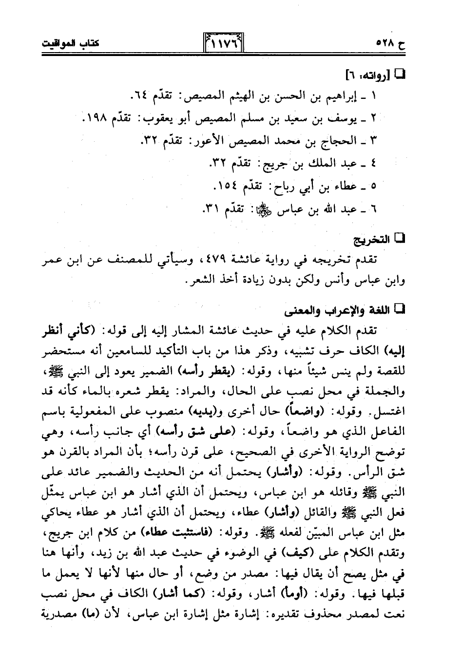 تقدم الكلام عليه في حديث عائشة المشار إليه إلى قوله: (كأني أنظر إليه) الكاف حرف تشبيه، وذكر هذا من باب التأكيد للسامعين أنه مستحضر للقصة ولم ينس شيئًا منها، وقوله: (يقطر رأسه) الضمير يعود إلى النبي - صلى الله عليه وسلم -، والجملة في محل نصب على الحال، والمراد: يقطر شعره بالماء كأنه قد اغتسل. وقوله: (واضعًا) حال أخرى و (يديه) منصوب على المفعولية باسم الفاعل الذي هو واضعًا، وقوله: (على شق رأسه) أي جانب رأسه، وهي توضح الرواية الأخرى في الصحيح، على قرن رأسه؛ بأن المراد بالقرن هو شق الرأس. وقوله: (وأشار) يحتمل أنه من الحديث والضمير عائد على النبي - صلى الله عليه وسلم - وقائله هو ابن عباس، ويحتمل أن الذي أشار هو ابن عباس يمثل فعل النبي - صلى الله عليه وسلم - والقائل (وأشار) عطاء، ويحتمل أن الذي أشار هو عطاء يحاكي مثل ابن عباس المبيّن لفعله - صلى الله عليه وسلم -. وقوله: (فاستثبت عطاء) من كلام ابن جريج، وتقدم الكلام على (كيف) في الوضوء في حديث عبد الله بن زيد، وأنها هنا في مثل يصح أن يقال فيها: مصدر من وضع، أو حال منها لأنها لا يعمل ما قبلها فيها. وقوله: (أومأ) أشار، وقوله: (كما أشار) الكاف في محل نصب نعت لمصدر محذوف تقديره: إشارة مثل إشارة ابن عباس، لأن (ما) مصدرية
