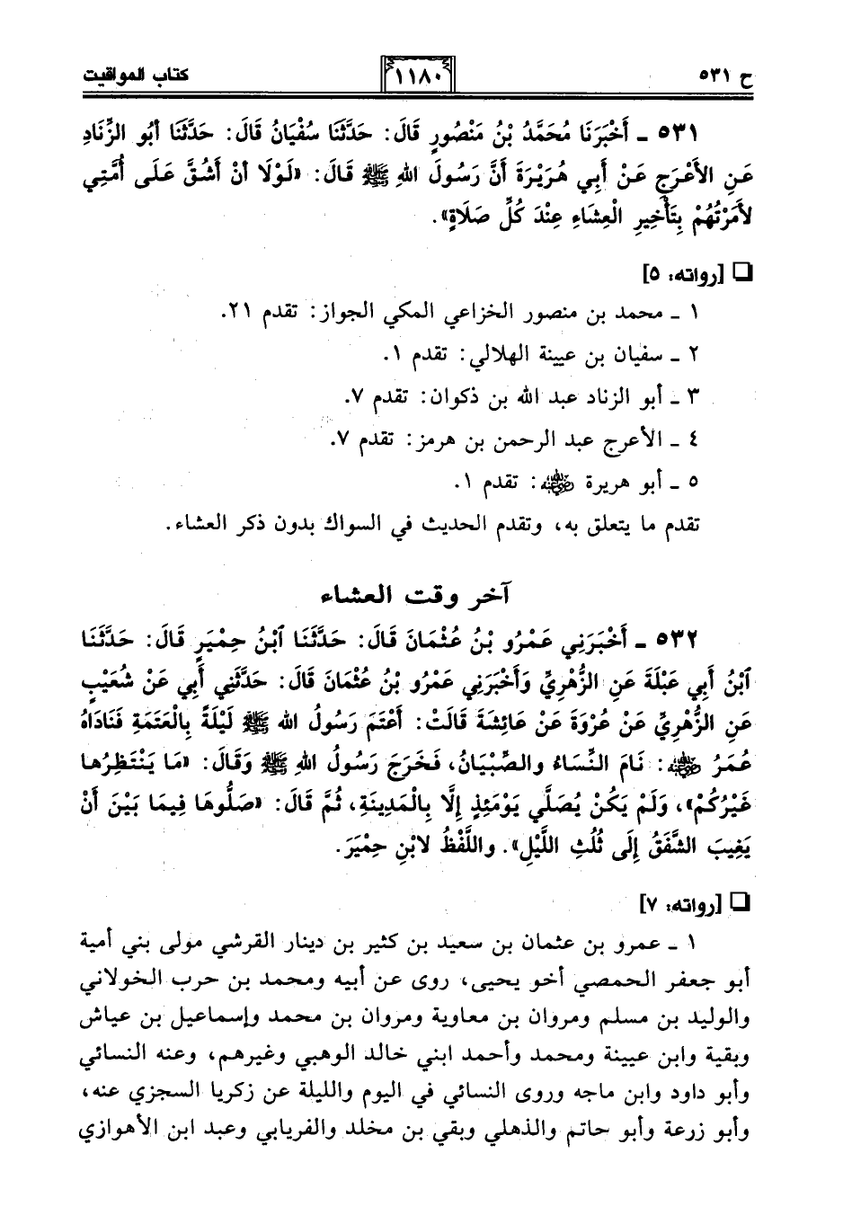 531 - أَخْبَرَنَا مُحَمَّدُ بْنُ مَنْصُورٍ قَالَ: حَدَّثَنَا سُفْيَانُ قَالَ: حَدَّثَنَا أَبُو الزِّنَادِ عَنِ الأَعْرَجِ عَنْ أَبِي هُرَيْرَةَ أَنَّ رَسُولَ اللَّهِ - صلى الله عليه وسلم - قَالَ: "لَوْلَا أَنْ أَشُقَّ عَلَى أُمَّتِي لأَمَرْتُهُمْ بِتَأْخِيرِ الْعِشَاءِ وَبِالسِّوَاكِ عِنْدَ كُلِّ صَلَاةٍ".