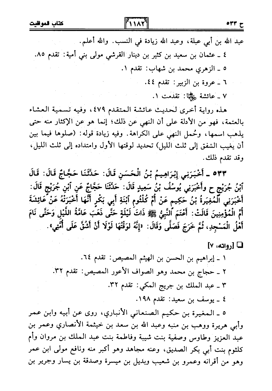 533 - أَخْبَرَنِي إِبْرَاهِيمُ بْنُ الْحَسَنِ قَالَ: حَدَّثَنَا حَجَّاجٌ قَالَ: قَالَ ابْنُ جُرَيْجٍ ح وَأَخْبَرَنِي يُوسُفُ بْنُ سَعِيدٍ قَالَ: حَدَّثَنَا حَجَّاجٌ عَنِ ابْنِ جُرَيْجٍ قَالَ: أَخْبَرَنِي الْمُغِيرَةُ بْنُ حَكِيمٍ عَنْ أُمِّ كُلْثُومٍ ابْنَةِ أَبِي بَكْرٍ أَنَّهَا أَخْبَرَتْهُ عَنْ عَائِشَةَ أُمِّ الْمُؤْمِنِينَ قَالَتْ: أَعْتَمَ النَّبِيُّ - صلى الله عليه وسلم - ذَاتَ لَيْلَةٍ حَتَّى ذَهَبَ عَامَّةُ اللَّيْلِ وَحَتَّى نَامَ أَهْلُ الْمَسْجِدِ، ثُمَّ خَرَجَ فَصَلَّى وَقَالَ: "إِنَّهُ لَوَقْتُهَا لَوْلَا أَنْ أَشُقَّ عَلَى أُمَّتِي".