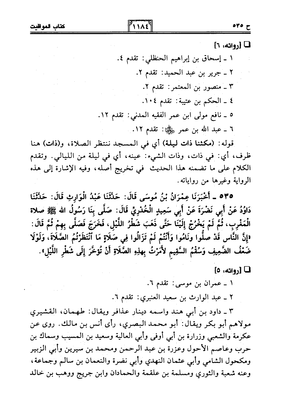535 - أَخْبَرَنَا عِمْرَانُ بْنُ مُوسَى قَالَ: حَدَّثَنَا عَبْدُ الْوَارِثِ قَالَ: حَدَّثَنَا دَاوُدُ عَنْ أَبِي نَضْرَةَ عَنْ أَبِي سَعِيدٍ الْخُدْرِيِّ قَالَ: صَلَّى بِنَا رَسُولُ اللَّهِ - صلى الله عليه وسلم - صَلَاةَ الْمَغْرِبِ، ثُمَّ لَمْ يَخْرُجْ إِلَيْنَا حَتَّى ذَهَبَ شَطْرُ اللَّيْلِ، فَخَرَجَ فَصَلَّى بِهِمْ ثُمَّ قَالَ: "إِنَّ النَّاسَ قَدْ صَلُّوا وَنَامُوا وَأَنْتُمْ لَمْ تَزَالُوا فِي صَلَاةٍ مَا انْتَظَرْتُمُ الصَّلَاةَ، وَلَوْلَا ضَعْفُ الضَّعِيفِ وَسُقْمُ السَّقِيمِ لأَمَرْتُ بِهَذِهِ الصَّلَاةِ أَنْ تُؤَخَّرَ إِلَى شَطْرِ اللَّيْلِ".