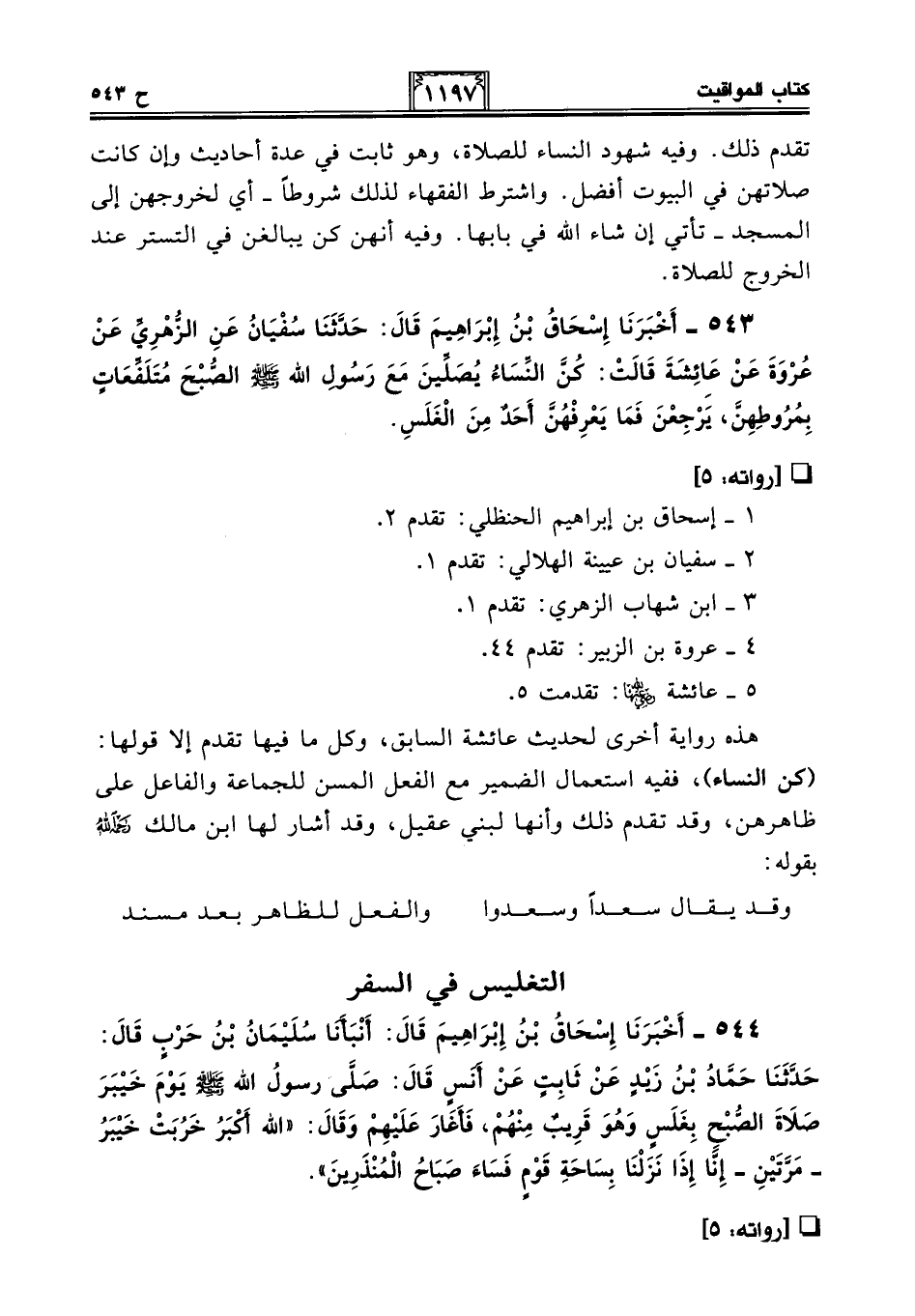 543 - أَخْبَرَنَا إِسْحَاقُ بْنُ إِبْرَاهِيمَ قَالَ: حَدَّثَنَا سُفْيَانُ عَنِ الزُّهْرِيِّ عَنْ عُرْوَةَ عَنْ عَائِشَةَ قَالَتْ: كُنَّ النِّسَاءُ يُصَلِّينَ مَعَ رَسُولِ اللَّهِ - صلى الله عليه وسلم - الصُّبْحَ مُتَلَفِّعَاتٍ بِمُرُوطِهِنَّ، يَرْجِعْنَ فَمَا يَعْرِفْهُنَّ أَحَدٌ مِنَ الْغَلَسِ.