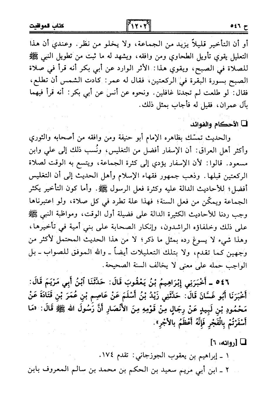 546 - أَخْبَرَنِي إِبْرَاهِيمُ بْنُ يَعْقُوبَ قَالَ: حَدَّثَنَا ابْنُ أَبِي مَرْيَمَ قَالَ: أَخْبَرَنَا أَبُو غَسَّانَ قَالَ: حَدَّثَنِي زَيْدُ بْنُ أَسْلَمَ عَنْ عَاصِمِ بْنِ عُمَرَ بْنِ قَتَادَةَ عَنْ مَحْمُودِ بْنِ لَبِيدٍ عَنْ رِجَالٍ مِنْ قَوْمِهِ مِنَ الأَنْصَارِ أَنَّ رَسُولَ اللَّهِ - صلى الله عليه وسلم - قَالَ: "مَا أَسْفَرْتُمْ بِالْفَجْرِ فَإِنَّهُ أَعْظَمُ بِالأَجْرِ".