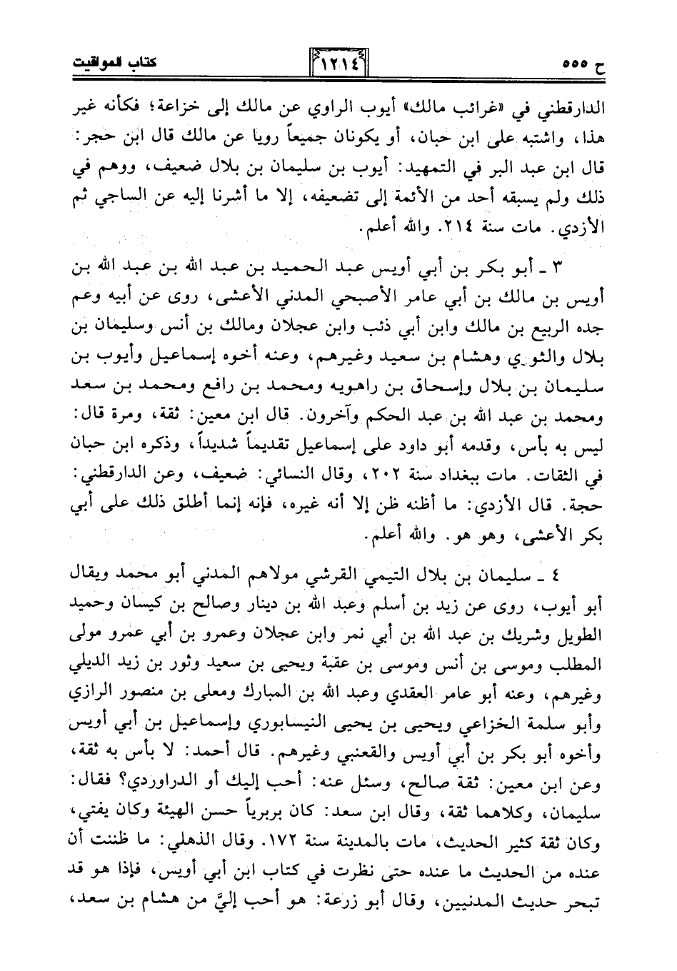 4 - سليمان بن بلال التيمي القرشي مولاهم المدني أبو محمد ويقال أبو أيوب، روى عن زيد بن أسلم وعبد الله بن دينار وصالح بن كيسان وحميد الطويل وشريك بن عبد الله بن أبي نمر وابن عجلان وعمرو بن أبي عمرو مولى المطلب وموسى بن أنس وموسى بن عقبة ويحيى بن سعيد وثور بن زيد الديلي وغيرهم، وعنه أبو عامر العقدي وعبد الله بن المبارك ومعلى بن منصور الرازي وأبو سلمة الخزاعي ويحيى بن يحيى النيسابوري وإسماعيل بن أبي أويس وأخوه أبو بكر بن أبي أويس والقعنبي وغيرهم. قال أحمد: لا بأس به ثقة، وعن ابن معين: ثقة صالح، وسئل عنه: أحب إليك أو الدراوردي؟ فقال: سليمان، وكلاهما ثقة، وقال ابن سعد: كان بربريًا حسن الهيئة وكان يفتي، وكان ثقة كثير الحديث، مات بالمدينة سنة 172. وقال الذهلي: ما ظننت أن عنده من الحديث ما عنده حتى نظرت في كتاب ابن أبي أويس، فإذا هو قد تبحر حديث المدنيين، وقال أبو زرعة: هو أحب إليَّ من هشام بن سعد،