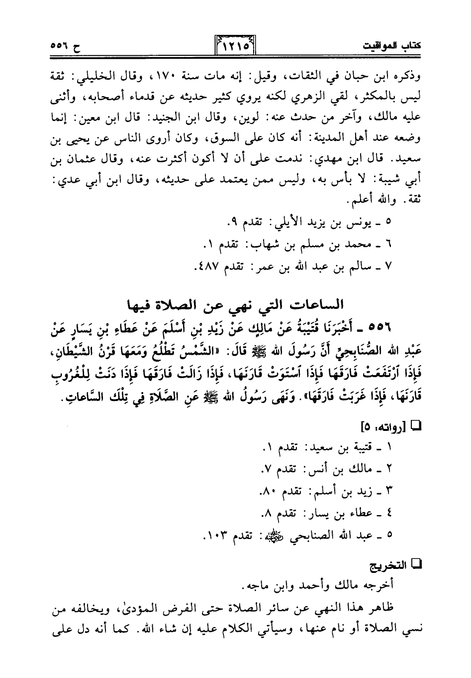 556 - أَخْبَرَنَا قُتَيْبَةُ عَنْ مَالِكٍ عَنْ زَيْدِ بْنِ أَسْلَمَ عَنْ عَطَاءِ بْنِ يَسَارٍ عَنْ عَبْدِ اللَّهِ الصُّنَابِحِيِّ أَنَّ رَسُولَ اللَّهِ - صلى الله عليه وسلم - قَالَ: "الشَّمْسُ تَطْلُعُ وَمَعَهَا قَرْنُ الشَّيْطَانِ، فَإِذَا ارْتَفَعَتْ فَارَقَهَا فَإِذَا اسْتَوَتْ قَارَنَهَا، فَإِذَا زَالَتْ فَارَقَهَا فَإِذَا دَنَتْ لِلْغُرُوبِ قَارَنَهَا، فَإِذَا غَرَبَتْ فَارَقَهَا". وَنَهَى رَسُولُ اللَّهِ - صلى الله عليه وسلم - عَنِ الصَّلَاةِ فِي تِلْكَ السَّاعَاتِ.