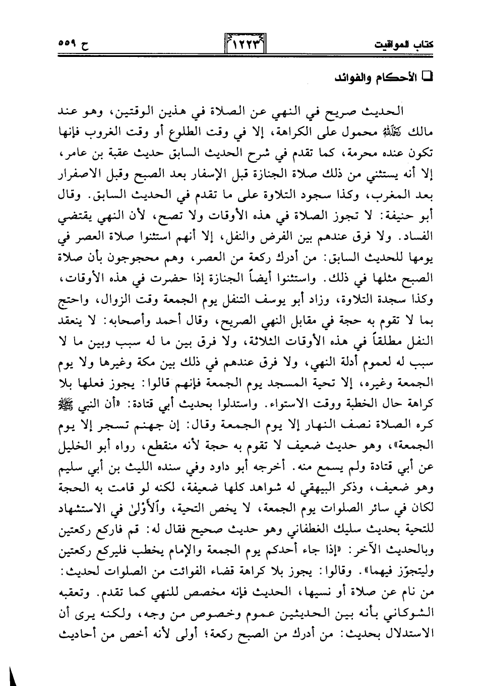 الحديث صريح في النهي عن الصلاة في هذين الوقتين، وهو عند مالك -رحمه الله- محمول على الكراهة، إلا في وقت الطلوع أو وقت الغروب فإنها تكون عنده محرمة، كما تقدم في شرح الحديث السابق حديث عقبة بن عامر، إلا أنه يستثني من ذلك صلاة الجنازة قبل الإسفار بعد الصبح وقبل الإصفرار بعد المغرب، وكذا سجود التلاوة على ما تقدم في الحديث السابق. وقال أبو حنيفة: لا تجوز الصلاة في هذه الأوقات ولا تصح، لأن النهي يقتضي الفساد. ولا فرق عندهم بين الفرض والنفل، إلا أنهم استثنوا صلاة العصر في يومها للحديث السابق: من أدرك ركعة من العصر، وهم محجوجون بأن صلاة الصبح مثلها في ذلك. واستثنوا أيضًا الجنازة إذا حضرت في هذه الأوقات، وكذا سجدة التلاوة، وزاد أبو يوسف التنفل يوم الجمعة وقت الزوال، واحتج بما لا تقوم به حجة في مقابل النهي الصريح، وقال أحمد وأصحابه: لا ينعقد النفل مطلقًا في هذه الأوقات الثلاثة، ولا فرق بين ما له سبب وبين ما لا سبب له لعموم أدلة النهي، ولا فرق عندهم في ذلك بين مكة وغيرها ولا يوم الجمعة وغيره، إلا تحية المسجد يوم الجمعة فإنهم قالوا: يجوز فعلها بلا كراهة حال الخطبة ووقت الإستواء. واستدلوا بحديث أبي قتادة: "أن النبي - صلى الله عليه وسلم - كره الصلاة نصف النهار إلا يوم الجمعة وقال: إن جهنم تسجر إلا يوم الجمعة"، وهو حديث ضعيف لا تقوم به حجة لأنه منقطع، رواه أبو الخليل عن أبي قتادة ولم يسمع منه. أخرجه أبو داود وفي سنده الليث بن أبي سليم وهو ضعيف، وذكر البيهقي له شواهد كلها ضعيفة، لكنه لو قامت به الحجة لكان في سائر الصلوات يوم الجمعة، لا يخص التحية، والأَوْلى في الإستشهاد للتحية بحديث سليك الغطفاني وهو حديث صحيح فقال له: قم فاركع ركعتين وبالحديث الآخر: "إذا جاء أحدكم يوم الجمعة والإمام يخطب فليركع ركعتين وليتجوّز فيهما". وقالوا: يجوز بلا كراهة قضاء الفوائت من الصلوات لحديث: من نام عن صلاة أو نسيها، الحديث فإنه مخصص للنهي كما تقدم. وتعقبه الشوكاني بأنه بين الحديثين عموم وخصوص من وجه، ولكنه يرى أن الإستدلال بحديث: من أدرك من الصبح ركعة؛ أولى لأنه أخص من أحاديث