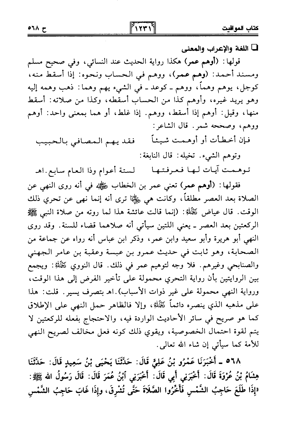 568 - أَخْبَرَنَا عَمْرُو بْنُ عَلِيٍّ قَالَ: حَدَّثَنَا يَحْيَى بْنُ سَعِيدٍ قَالَ: حَدَّثَنَا هِشَامُ بْنُ عُرْوَةَ قَالَ: أَخْبَرَنِي أَبِي قَالَ: أَخْبَرَنِي ابْنُ عُمَرَ قَالَ: قَالَ رَسُولُ اللَّهِ - صلى الله عليه وسلم -: "إِذَا طَلَعَ حَاجِبُ الشَّمْسِ فَأَخِّرُوا الصَّلَاةَ حَتَّى تُشْرِقَ، وَإِذَا غَابَ حَاجِبُ الشَّمْسِ