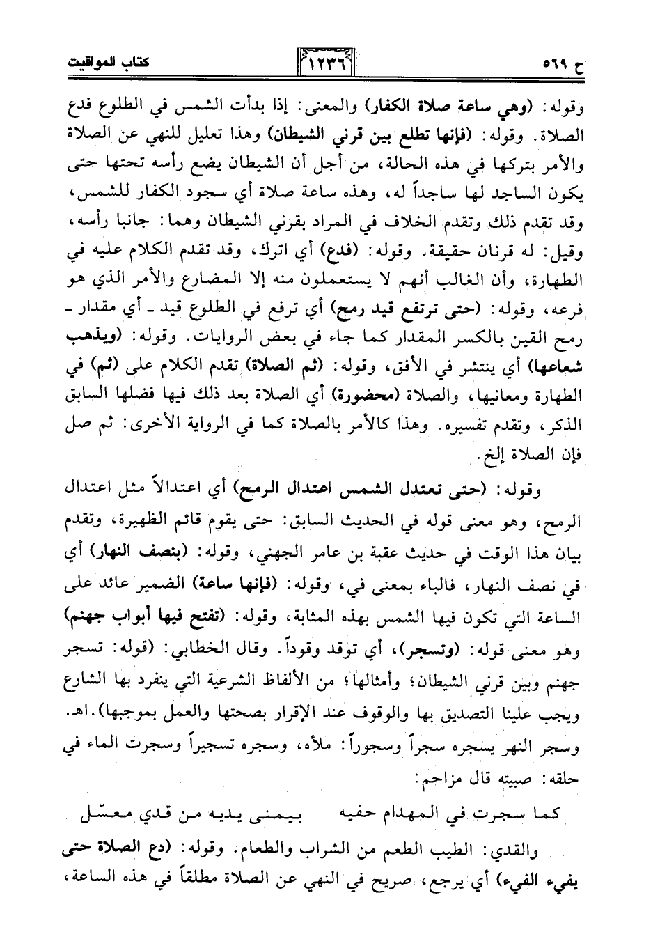 وقوله: (وهي ساعة صلاة الكفار) والمعنى: إذا بدأت الشمس في الطلوع فدع الصلاة. وقوله: (فإنها تطلع بين قرني الشيطان) وهذا تعليل للنهي عن الصلاة والأمر بتركها في هذه الحالة، من أجل أن الشيطان يضع رأسه تحتها حتى يكون الساجد لها ساجدًا له، وهذه ساعة صلاة أي سجود الكفار للشمس، وقد تقدم ذلك وتقدم الخلاف في المراد بقرني الشيطان وهما: جانبا رأسه، وقيل: له قرنان حقيقة. وقوله: (فدع) أي اترك، وقد تقدم الكلام عليه في الطهارة، وأن الغالب أنهم لا يستعملون منه إلا المضارع والأمر الذي هو فرعه، وقوله: (حتى ترتفع قيد رمح) أي ترفع في الطلوع قيد -أي مقدار- رمح القين بالكسر المقدار كما جاء في بعض الروايات. وقوله: (ويذهب شعاعها) أي ينتشر في الأفق، وقوله: (ثم الصلاة) تقدم الكلام على (ثم) في الطهارة ومعانيها، والصلاة (محضورة) أي الصلاة بعد ذلك فيها فضلها السابق الذكر، وتقدم تفسيره. وهذا كالأمر بالصلاة كما في الرواية الأخرى: ثم صل فإن الصلاة إلخ.