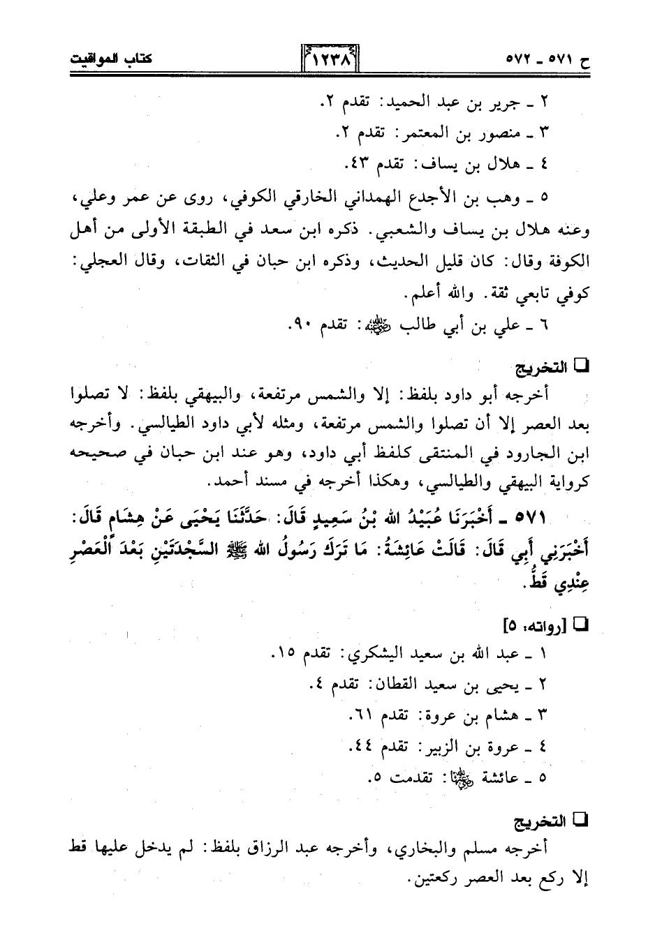571 - أَخْبَرَنَا عُبَيْدُ اللَّهِ بْنُ سَعِيدٍ قَالَ: حَدَّثَنَا يَحْيَى عَنْ هِشَامٍ قَالَ: أَخْبَرَنِي أَبِي قَالَ: قَالَتْ عَائِشَةُ: مَا تَرَكَ رَسُولُ اللَّهِ - صلى الله عليه وسلم - السَّجْدَتَيْنِ بَعْدَ الْعَصْرِ عِنْدِي قَطُّ.