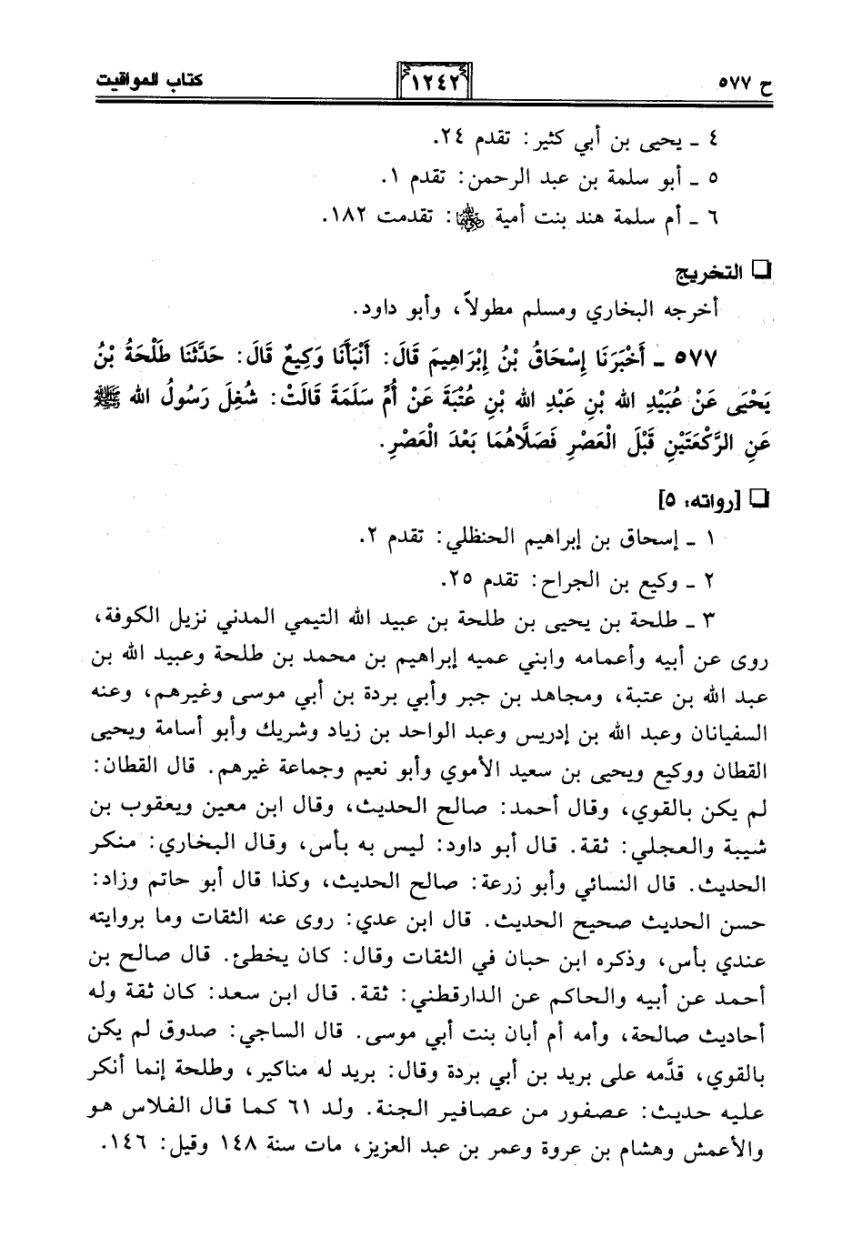 577 - أَخْبَرَنَا إِسْحَاقُ بْنُ إِبْرَاهِيمَ قَالَ: أَنْبَأَنَا وَكِيعٌ قَالَ: حَدَّثَنَا طَلْحَةُ بْنُ يَحْيَى عَنْ عُبَيْدِ اللَّهِ بْنِ عَبْدِ اللَّهِ بْنِ عُتْبَةَ عَنْ أُمِّ سَلَمَةَ قَالَتْ: شُغِلَ رَسُولُ اللَّهِ - صلى الله عليه وسلم - عَنِ الرَّكْعَتَيْنِ قَبْلَ الْعَصْرِ فَصَلَّاهُمَا بَعْدَ الْعَصْرِ.