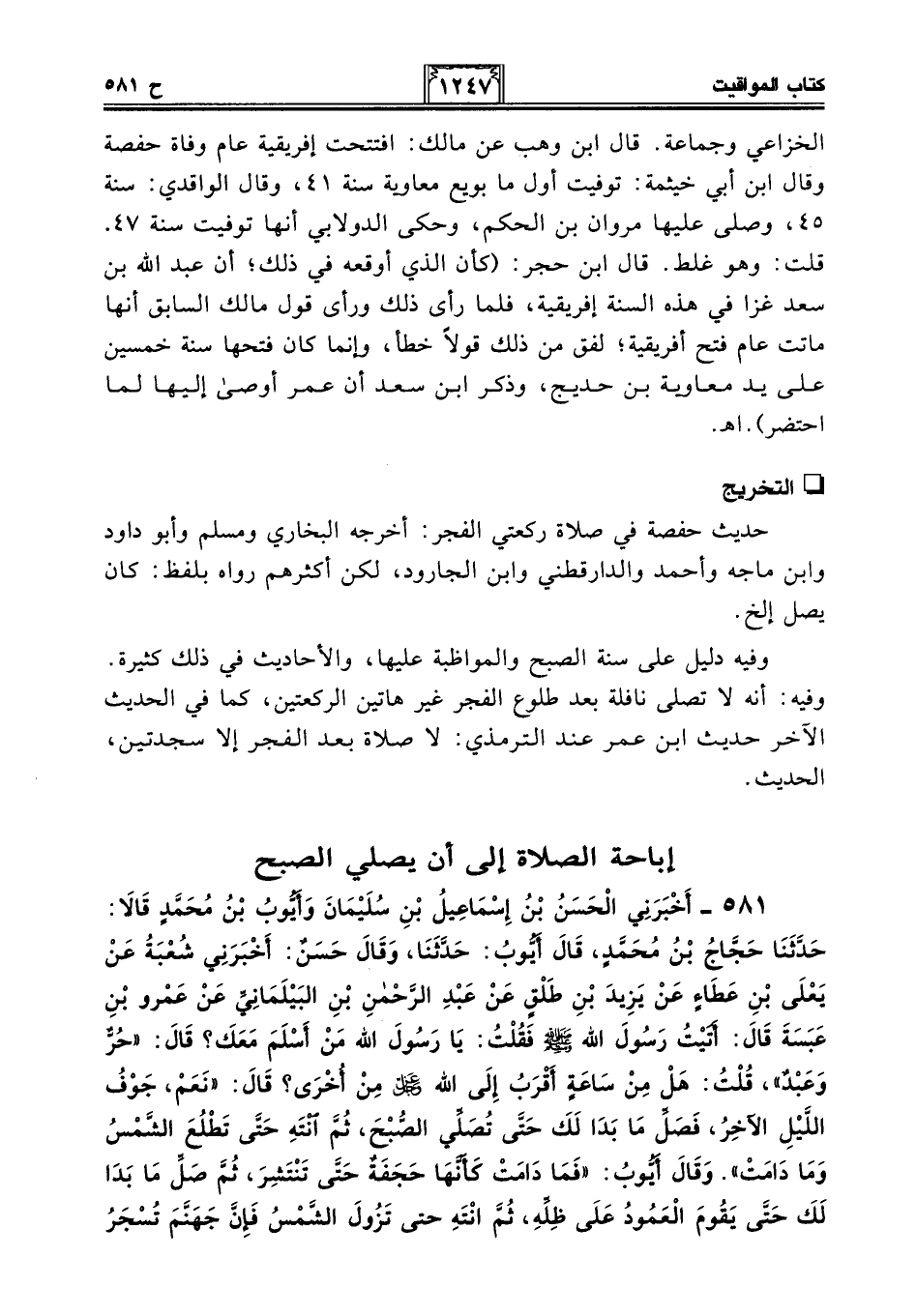 حديث حفصة في صلاة ركعتي الفجر: أخرجه البخاري ومسلم وأبو داود وابن ماجه وأحمد والدارقطني وابن الجارود، لكن أكثرهم رواه بلفظ: كان يصل إلخ.