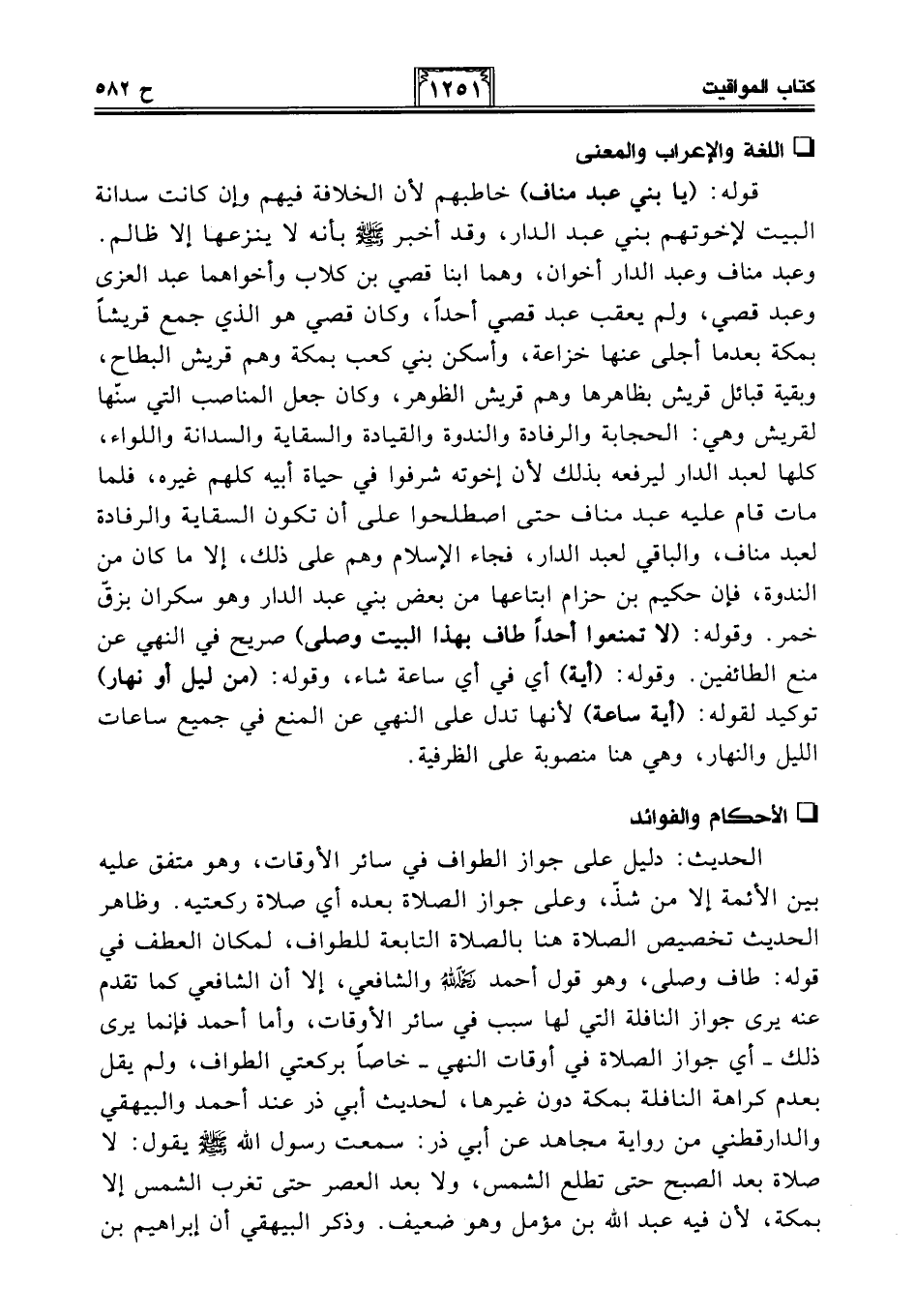 قوله: (يا بني عبد مناف) خاطبهم لأن الخلافة فيهم وإن كانت سدانة البيت لإخوتهم بني عبد الدار، وقد أخبر - صلى الله عليه وسلم - بأنه لا ينزعها إلا ظالم. وعبد مناف وعبد الدار أخوان، وهما ابنا قصي بن كلاب وأخواهما عبد العزى وعبد قصي، ولم يعقب عبد قصي أحدًا، وكان قصي هو الذي جمع قريشًا بمكة بعدما أجلى عنها خزاعة، وأسكن بني كعب بمكة وهم قريش البطاح، وبقية قبائل قريش بظاهرها وهم قريش الظوهر، وكان جعل المناصب التي سنّها لقريش وهي: الحجابة والرفادة والندوة والقيادة والسقاية والسدانة واللواء، كلها لعبد الدار ليرفعه بذلك لأن إخوته شرفوا في حياة أبيه كلهم غيره، فلما مات قام عليه عبد مناف حتى اصطلحوا على أن تكون السقاية والرفادة لعبد مناف، والباقي لعبد الدار، فجاء الإِسلام وهم على ذلك، إلا ما كان من الندوة، فإن حكيم بن حزام ابتاعها من بعض بني عبد الدار وهو سكران بزقّ خمر. وقوله: (لا تمنعوا أحدًا طاف بهذا البيت وصلى) صريح في النهي عن منع الطائفين. وقوله: (أية) أي في أي ساعة شاء، وقوله: (من ليل أو نهار) توكيد لقوله: (أية ساعة) لأنها تدل على النهي عن المنع في جميع ساعات الليل والنهار، وهي هنا منصوبة على الظرفية.