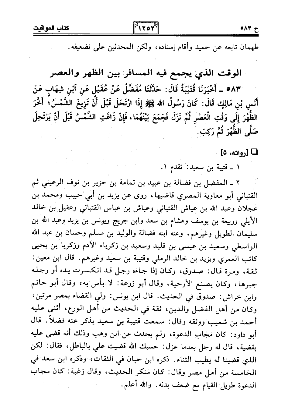 2 - المفضل بن فضالة بن عبيد بن تمامة بن حزير بن نوف الرعيني ثم القتباني أبو معاوية المصري قاضيها، روى عن يزيد بن أبي حبيب ومحمد بن عجلان وعبد الله بن عياش القتباني وعياش بن عباس القتباني وعقيل بن خالد الأيلي وربيعة بن يوسف وهشام بن سعد وابن جريج ويونس بن يزيد وعبد الله بن سليمان الطويل وغيرهم، وعنه ابنه فضالة والوليد بن مسلم وحسان بن عبد الله الواسطي وسعيد بن عيسى بن قليد وسعيد بن زكرياء الآدم وزكريا بن يحيى كاتب العمري ويزيد بن خالد الرملي وقتيبة بن سعيد وغيرهم. قال ابن معين: ثقة، ومرة قال: صدوق، وكان إذا جاءه رجل قد انكسرت يده أو رجله جبرها، وكان يصنع الأرحية، وقال أبو زرعة: لا بأس به، وقال أبو حاتم وابن خراش: صدوق في الحديث. قال ابن يونس: ولي القضاء بمصر مرتين، وكان من أهل الفضل والدين، ثقة في الحديث من أهل الورع، أثنى عليه أحمد بن شعيب ووثقه وقال: سمعت قتيبة بن سعيد يذكر عنه فضلًا. قال أبو داود: كان مجاب الدعوة، ولم يحدث عن ابن وهب وذلك أنه قضى عليه بقضية، قال له رجل بعدما عزل: حسبك الله قضيت علي بالباطل، فقال: لكن الذي قضينا له يطيب الثناء. ذكره ابن حبان في الثقات، وذكره ابن سعد في الخامسة من أهل مصر وقال: كان منكر الحديث، وقال زغبة: كان مجاب الدعوة طويل القيام مع ضعف بدنه. والله أعلم.