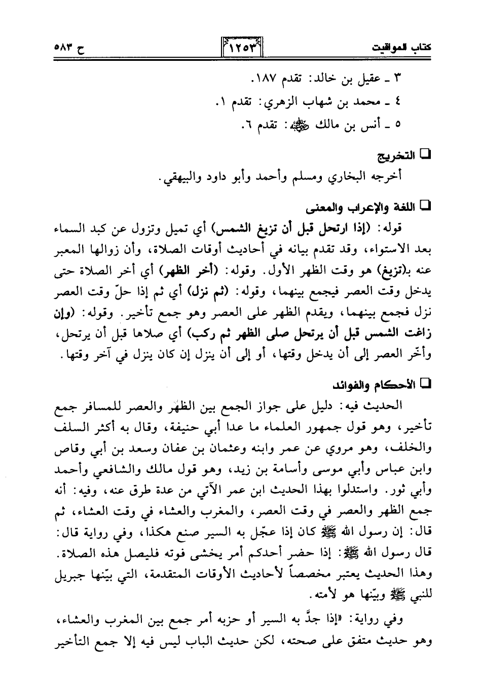 الحديث فيه: دليل على جواز الجمع بين الظهر والعصر للمسافر جمع تأخير، وهو قول جمهور العلماء ماعدا أبي حنيفة، وقال به أكثر السلف والخلف، وهو مروي عن عمر وابنه وعثمان بن عفان وسعد بن أبي وقاص وابن عباس وأبي موسى وأسامة بن زيد، وهو قول مالك والشافعي وأحمد وأبي ثور. واستدلوا بهذا الحديث ابن عمر الآتي من عدة طرق عنه، وفيه: أنه جمع الظهر والعصر في وقت العصر، والمغرب والعشاء في وقت العشاء، ثم قال: إن رسول الله - صلى الله عليه وسلم - كان إذا عجّل به السير صنع هكذا، وفي رواية قال: قال رسول الله - صلى الله عليه وسلم -: إذا حضر أحدكم أمر يخشى فوته فليصل هذه الصلاة. وهذا الحديث يعتبر مخصصًا لأحاديث الأوقات المتقدمة، التي بيّنها جبريل للنبي - صلى الله عليه وسلم - وبينها هو لأمته.