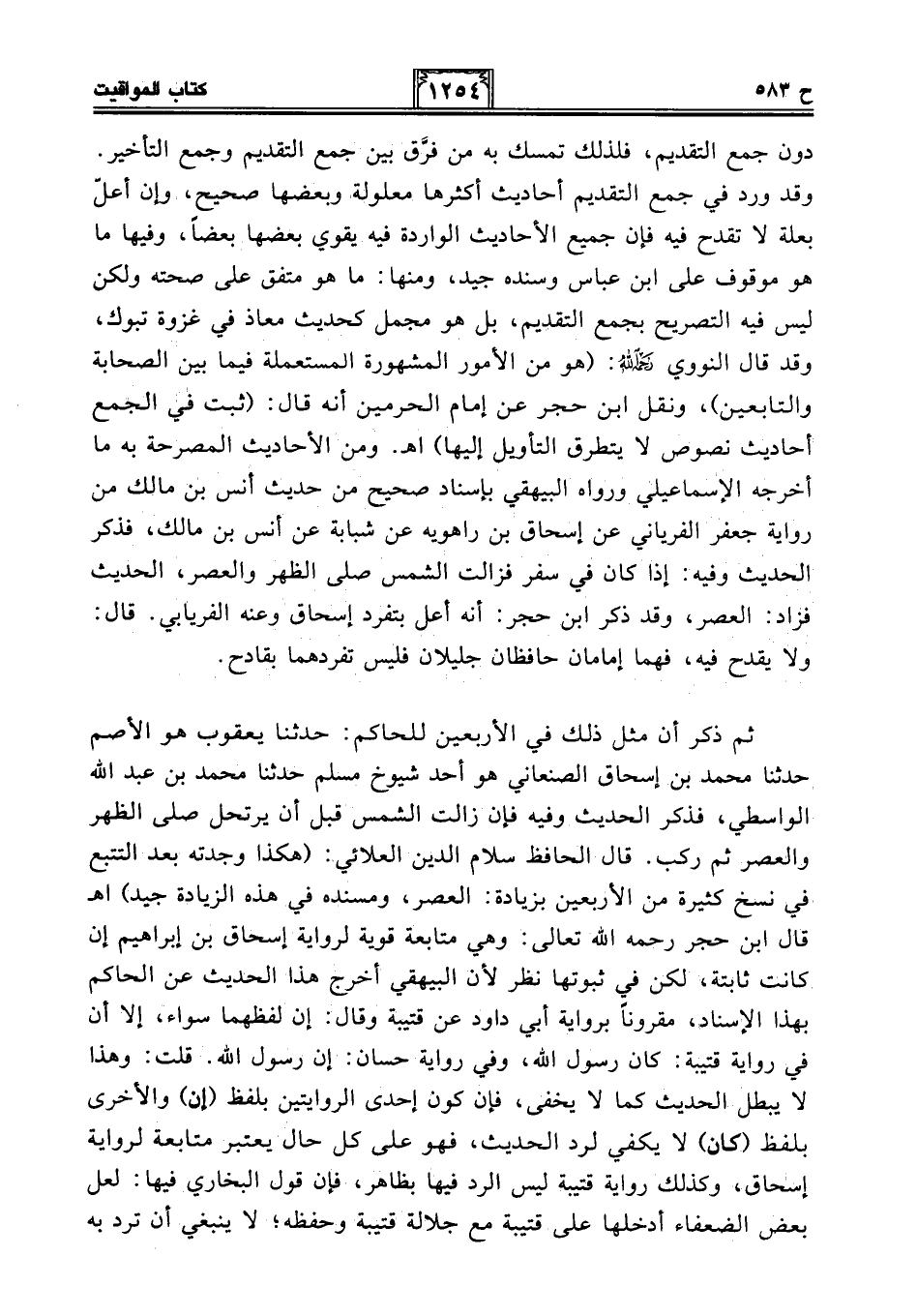 ثم ذكر أن مثل ذلك في الأربعين للحاكم: حدثنا يعقوب هو الأصم حدثنا محمَّد بن إسحاق الصنعاني هو أحد شيوخ مسلم حدثنا محمَّد بن عبد الله الواسطي، فذكر الحديث وفيه فإن زالت الشمس قبل أن يرتحل صلى الظهر والعصر ثم ركب. قال الحافظ سلام الدين العلائي: (هكذا وجدته بعد التتبع في نسخ كثيرة من الأربعين بزيادة: العصر، ومسنده في هذه الزيادة جيد) اهـ قال ابن حجر -رحمه الله تعالى-: وهي متابعة قوية لرواية إسحاق بن إبراهيم إن كانت ثابتة، لكن في ثبوتها نظر لأن البيهقي أخرج هذا الحديث عن الحاكم بهذا الإسناد، مقرونًا برواية أبي داود عن قتيبة وقال: إن لفظهما سواء، إلا أن في رواية قتيبة: كان رسول الله، وفي رواية حسان: إن رسول الله. قلت: وهذا لا يبطل الحديث كما لا يخفى، فإن كون إحدى الروايتين بلفظ (إن) والأخرى بلفظ (كان) لا يكفي لرد الحديث، فهو على كل حال يعتبر متابعة لرواية إسحاق، وكذلك رواية قتيبة ليس الرد فيها بظاهر، فإن قول البخاري فيها: لعل بعض الضعفاء أدخلها على قتيبة مع جلالة قتيبة وحفظه؛ لا ينبغي أن ترد به