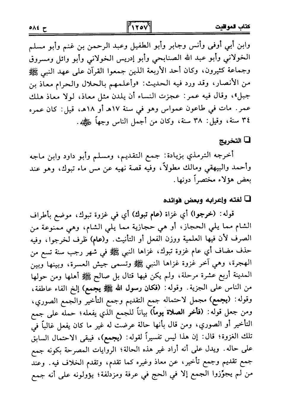 أخرجه الترمذي بزيادة: جمع التقديم، ومسلم وأبو داود وابن ماجه وأحمد والبيهقي ومالك مطولًا، وفيه قصة نهيه عن مس ماء تبوك، وهو عند بعض هؤلاء مختصرًا دونها.
