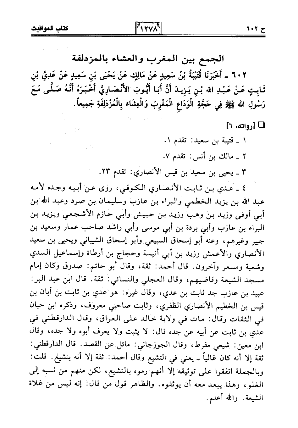 4 - عدي بن ثابت الأنصاري الكوفي، روى عن أبيه وجده لأمه عبد الله بن يزيد الخطمي والبراء بن عازب وسليمان بن صرد وعبد الله بن أبي أوفى وزيد بن وهب وزيد بن حبيش وأبي حازم الأشجعى ويزيد بن البراء بن عازب وأبي بردة بن أبي موسى وأبي راشد صاحب عمار وسعيد بن جبير وغيرهم، وعنه أبو إسحاق السبيعي وأبو إسحاق الشيباني ويحيى بن سعيد الأنصاري والأعمش وزيد بن أبي أنيسة وحجاج بن أرطاة وإسماعيل السدي وشعبة ومسعر وآخرون. قال أحمد: ثقة، وقال أبو حاتم: صدوق وكان إمام مسجد الشيعة وقاضيهم، وقال العجلي والنسائي: ثقة. قال ابن عبد البر: عبيد بن عازب جد ثابت بن عدي، وقال غيره: هو عدي بن ثابت بن أبان بن قيس بن الخطيم الأنصاري الظفري، وثابت صاحبي معروف، وذكره ابن حبان في الثقات وقال: مات في ولاية خالد على العراق، وقال الدارقطني في عدي بن ثابت عن أبيه عن جده قال: لا يثبت ولا يعرف أبوه ولا جده، وقال ابن معين: شيعي مفرط، وقال الجوزجاني: مائل عن القصد. قال الدارقطني: ثقة إلا أنه كان غاليًا -يعني في التشيع وقال أحمد: ثقة إلا أنه يتشيع. قلت: وبالجملة اتفقوا على توثيقه إلا أنهم رموه بالتشيع، لكن منهم من نسبه إلى الغلو، وهذا يبعد معه أن يوثقوه. والظاهر قول من قال: إنه ليس من غلاة الشيعة. والله أعلم.