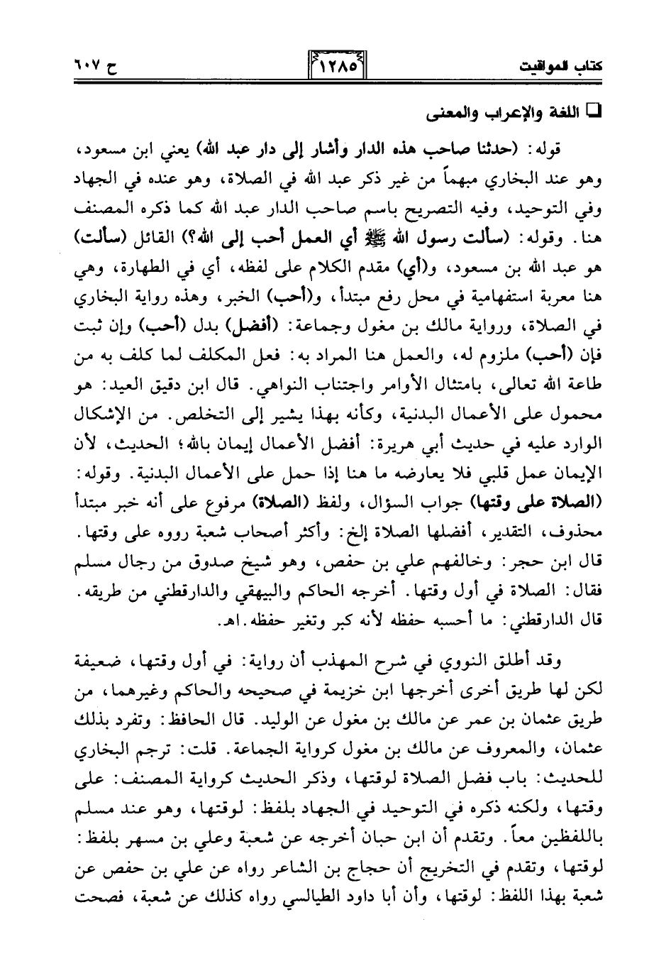 قوله: (حدثنا صاحب هذه الدار وأشار إلى دار عبد الله) يعني ابن مسعود، وهو عند البخاري مبهمًا من غير ذكر عبد الله في الصلاة، وهو عنده في الجهاد وفي التوحيد، وفيه التصريح باسم صاحب الدار عبد الله كما ذكره المصنف هنا. وقوله: (سألت رسول الله - صلى الله عليه وسلم - أي العمل أحب إلى الله؟ ) القائل (سألت) هو عبد الله بن مسعود، و (أي) مقدم الكلام على لفظه، أي في الطهارة، وهي هنا معربة استفهامية في محل رفع مبتدأ، و (أحب) الخبر، وهذه رواية البخاري في الصلاة، ورواية مالك بن مغول وجماعة: (أفضل) بدل (أحب) وإن ثبت فإن (أحب) ملزوم له، والعمل هنا المراد به: فعل المكلف لما كلف به من طاعة الله تعالى، بامتثال الأوامر واجتناب النواهي. قال ابن دقيق العيد: هو محمول على الأعمال البدنية، وكأنه بهذا يشير إلى التخلص. من الإشكال الوارد عليه في حديث أبي هريرة: أفضل الأعمال إيمان باللهِ؛ الحديث، لأن الإيمان عمل قلبي فلا يعارضه ما هنا إذا حمل على الأعمال البدنية. وقوله: (الصلاة على وقتها) جواب السؤال، ولفظ (الصلاة) مرفوع على أنه خبر مبتدأ محذوف، التقدير، أفضلها الصلاة إلخ: وأكثر أصحاب شعبة رووه على وقتها. قال ابن حجر: وخالفهم علي بن حفص، وهو شيخ صدوق من رجال مسلم فقال: الصلاة في أول وقتها. أخرجه الحاكم والبيهقي والدارقطني من طريقه. قال الدارقطني: ما أحسبه حفظه لأنه كبر وتغير حفظه. اهـ.