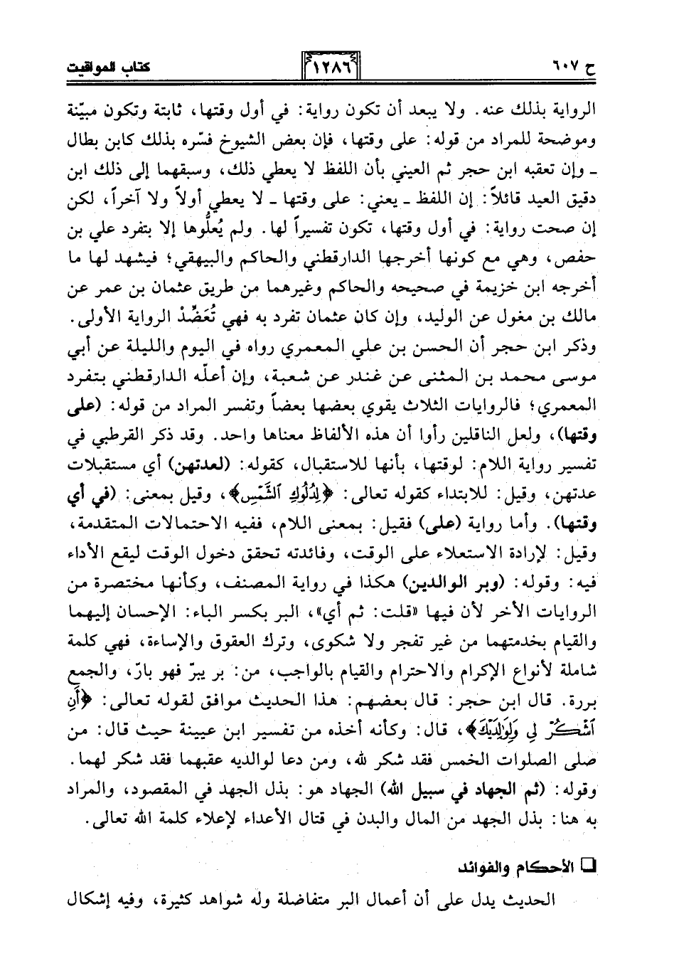 الرواية بذلك عنه. ولا يبعد أن تكون رواية: في أول وقتها، ثابتة وتكون مبيّنة وموضحة للمراد من قوله: على وقتها، فإن بعض الشيوخ فسّره بذلك كابن بطال -وإن تعقبه ابن حجر ثم العيني بأن اللفظ لا يعطي ذلك، وسبقهما إلى ذلك ابن دقيق العيد قائلًا: إن اللفظ -يعني: على وقتها- لا يعطي أولًا ولا آخرًا، لكن إن صحت رواية: في أول وقتها، تكون تفسيرًا لها. ولم يُعلوها إلا بتفرد علي بن حفص، وهي مع كونها أخرجها الدارقطني والحاكم والبيهقي , فيشهد لها ما أخرجه ابن خزيمة في صحيحه والحاكم وغيرهما من طريق عثمان بن عمر عن مالك بن مغول عن الوليد، وإن كان عثمان تفرد به فهي تُعَضِّدْ الرواية الأولى. وذكر ابن حجر أن الحسن بن علي المعمري رواه في اليوم والليلة عن أبي موسى محمَّد بن المثنى عن غندر عن شعبة، وإن أعلّه الدارقطني بتفرد المعمري؛ فالروايات الثلاث يقوي بعضها بعضًا وتفسر المراد من قوله: (على وقتها) , ولعل الناقلين رأوا أن هذه الألفاظ معناها واحد. وقد ذكر القرطبي في تفسير رواية اللام: لوقتها، بأنها للاستقبال، كقوله: (لعدتهن) أي مستقبلات عدتهن، وقيل: للابتداء كقوله تعالى: {لِدُلُوكِ الشَّمْسِ}، وقيل بمعنى: (في أي وقتها). وأما رواية (على) فقيل: بمعنى اللام، ففيه الاحتمالات المتقدمة، وقيل: لإرادة الاستعلاء على الوقت، وفائدته تحقق دخول الوقت ليقع الأداء فيه: وقوله: (وبر الوالدين) هكذا في رواية المصنف، وكأنها مختصرة من الروايات الأخر لأن فيها "قلت: ثم أي"، البر بكسر الباء: "الإحسان إليهما والقيام بخدمتهما من غير تضجر ولا شكوى، وترك العقوق والإساءة، فهي كلمة شاملة لأنواع الإكرام والاحترام والقيام بالواجب، من: بر يبرّ فهو بارّ، والجمع بررة. قال ابن حجر: قال بعضهم: هذا الحديث موافق لقوله تعالى: {أَنِ اشْكُرْ لِي وَلِوَالِدَيْكَ}، قال: وكأنه أخذه من تفسير ابن عيينة حيث قال: من صلى الصلوات الخمس فقد شكر لله، ومن دعا لوالديه عقبهما فقد شكر لهما. وقوله: (ثم الجهاد في سبيل الله) الجهاد هو: بذل الجهد في المقصود، والمراد به هنا: بذل الجهد من المال والبدن في قتال الأعداء لإعلاء كلمة الله تعالى.