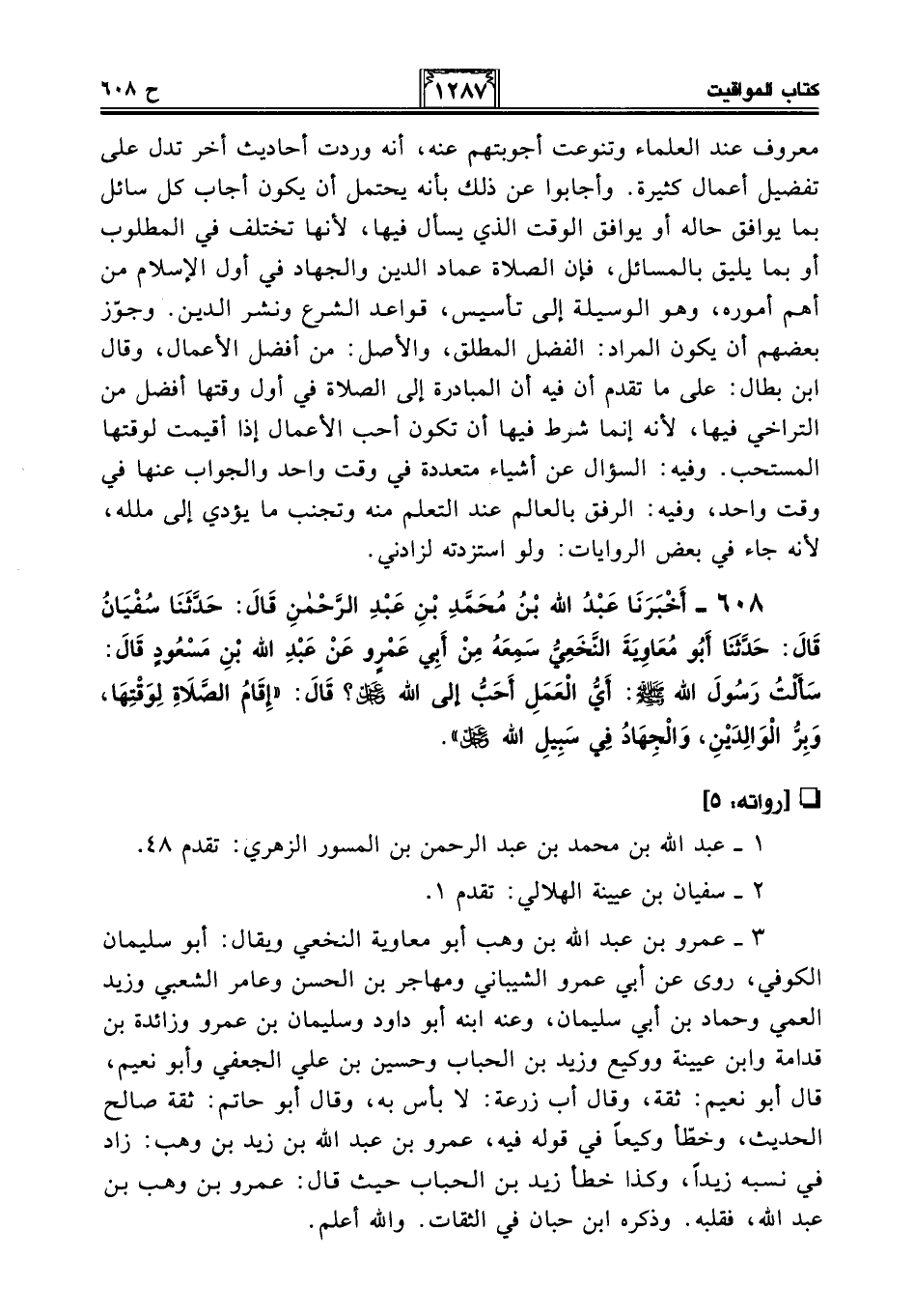 608 - أَخْبَرَنَا عَبْدُ اللَّهِ بْنُ مُحَمَّدِ بْنِ عَبْدِ الرَّحْمَنِ قَالَ: حَدَّثَنَا سُفْيَانُ قَالَ: حَدَّثَنَا أَبُو مُعَاوِيَةَ النَّخَعِيُّ سَمِعَهُ مِنْ أَبِي عَمْرٍو عَنْ عَبْدِ اللَّهِ بْنِ مَسْعُودٍ قَالَ: سَأَلْتُ رَسُولَ اللَّهِ - صلى الله عليه وسلم -: أَيُّ الْعَمَلِ أَحَبُّ إِلَى اللَّهِ -عَزَّ وَجَلَّ-؟ قَالَ: "إِقَامُ الصَّلَاةِ لِوَقْتِهَا، وَبِرُّ الْوَالِدَيْنِ، وَالْجِهَادُ فِي سَبِيلِ اللَّهِ -عَزَّ وَجَلَّ-".